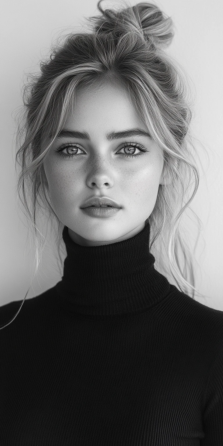 Headshot portrait of a young blonde woman with a ponytail, wearing a black turtleneck sweater, looking straight ahead in the style of Robert Capa. Black and white photography, shot on a Hasselblad X2D, soft light, chiaroscuro lighting, high contrast --ar 1:2 --stylize 750