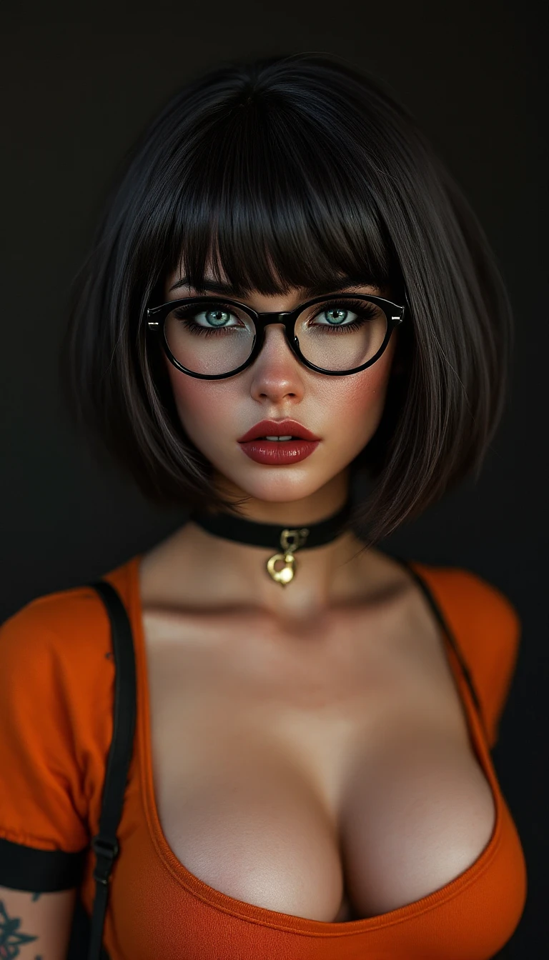 Photo of a ultra realistic of velma from scooby-doo (20 years), very sultry look, so hot girl, beautiful charismatic girl, so hot shot, beautiful innocence face, showing piercing, athletic body, a woman wearing eye glasses and an orange top, gorgeous figure, full body shot, goth style mood, dark eye makeup, in the style of jessica drossin, life-size figures, 4k, hyper realistic, focused, extreme details, cinematic, masterpiece,, intricate, real skin texture