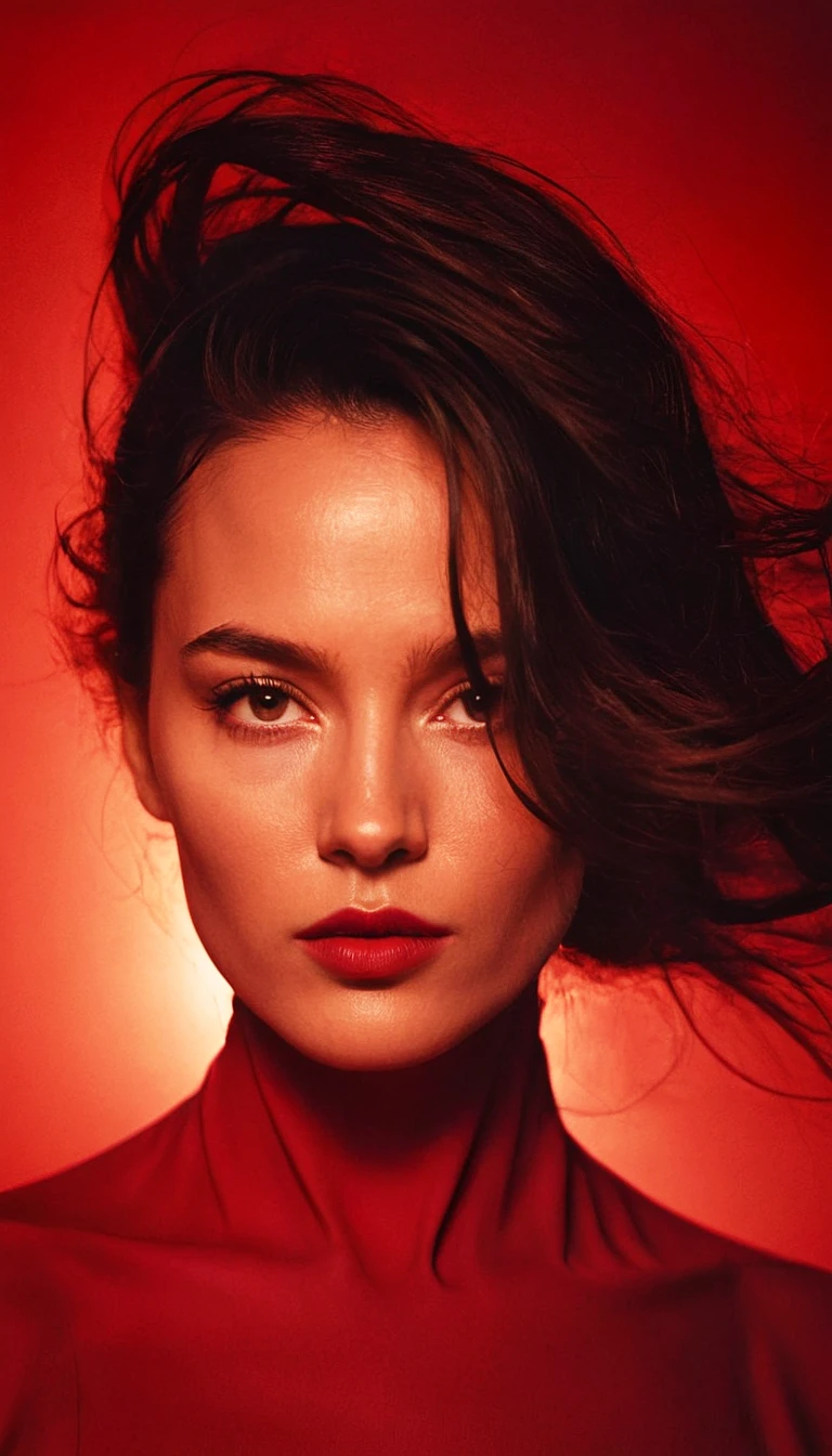 digital art, fashion editorial, a mystical woman's face is partially obscured by hair, set against an intense red background, shiny eyes, highres, realistic photo, professional photography, cinematic angle, dynamic light back shining,