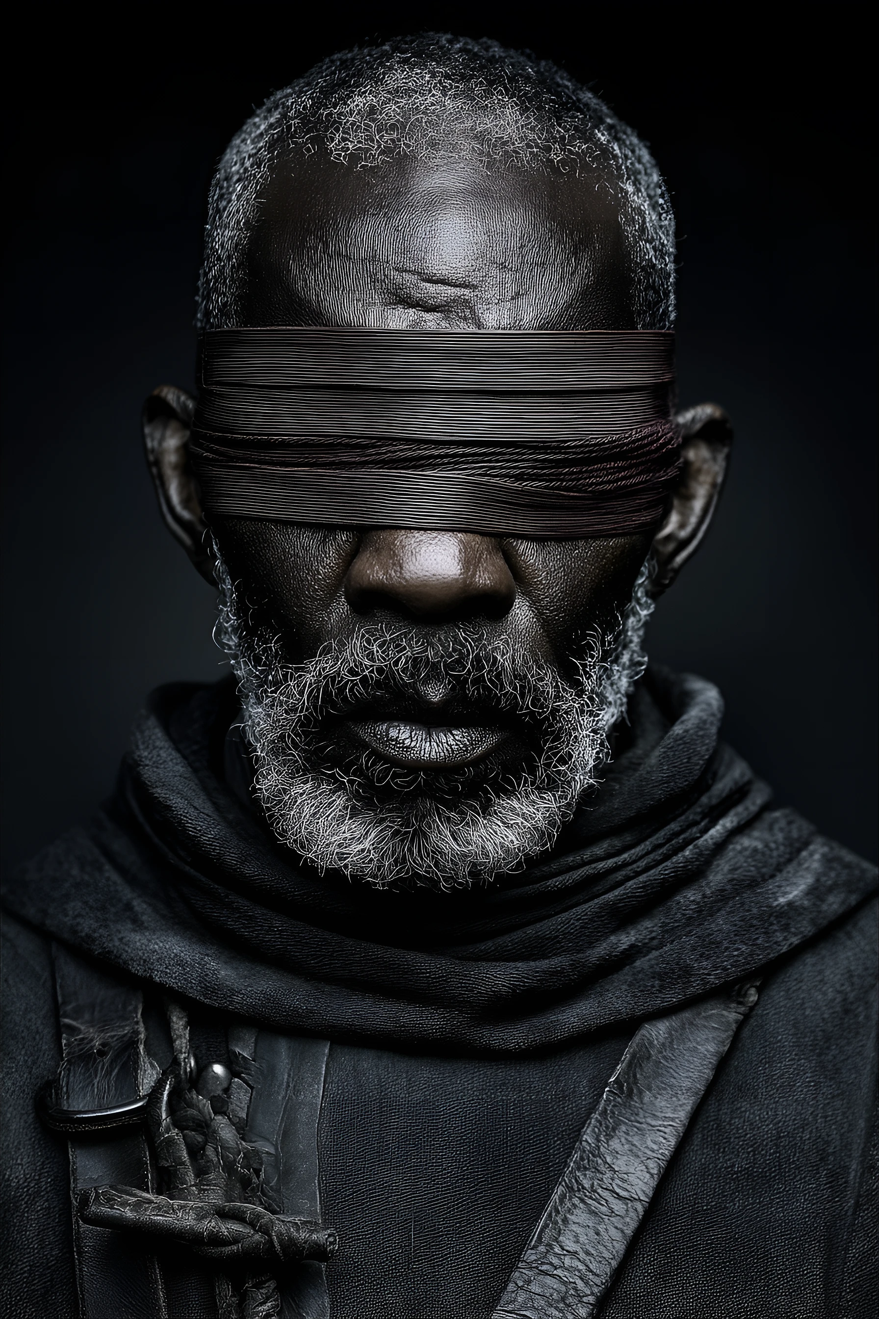 Close-up portrait of a mature man, likely middle-aged, with a serious expression. Dark skin tone, weathered and textured. A deep, rich, dark gray, almost black, tunic-like garment. The material of the garment is detailed with a leather-like texture. A band of deep reddish-brown fabric is wrapped across his eyes, like a blindfold. He has a gray-white beard and short gray hair. The face displays deep lines and wrinkles, suggesting age and experience. The facial features are strong and defined. The image has a dramatic, almost theatrical quality, with a dark background emphasizing the subject's features