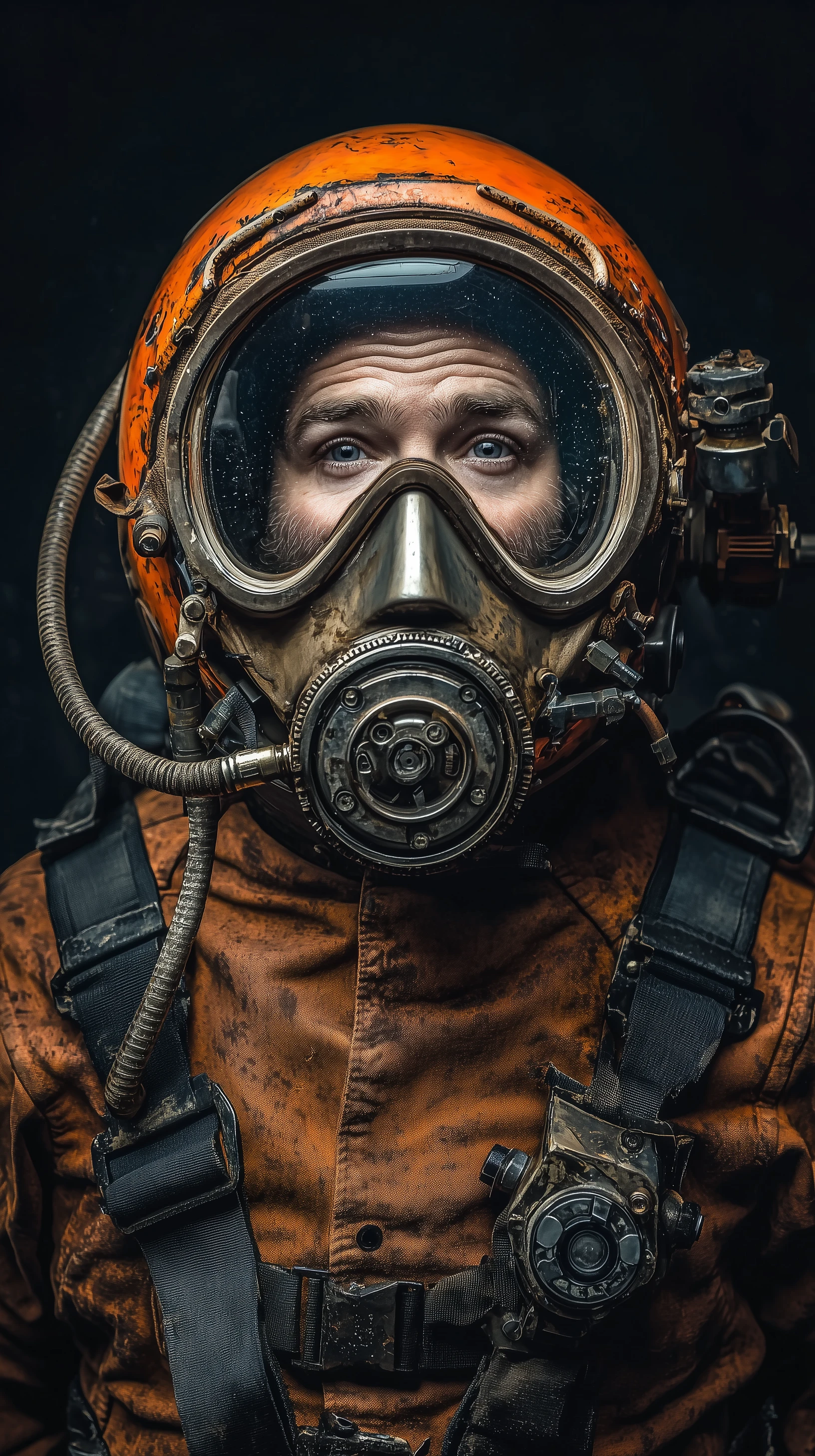 portrait, front upper-body, deep-sea diver model, wearing an old-fashioned helmet teal with burnt orange hue, Sony A7R IV full-frame camera, Zeiss 135mm f/2.8 lens, Paul Bellaart style, ultra-clean composition, modern art aesthetic, cinematic framing --ar 9:16 --quality 2 --style raw
