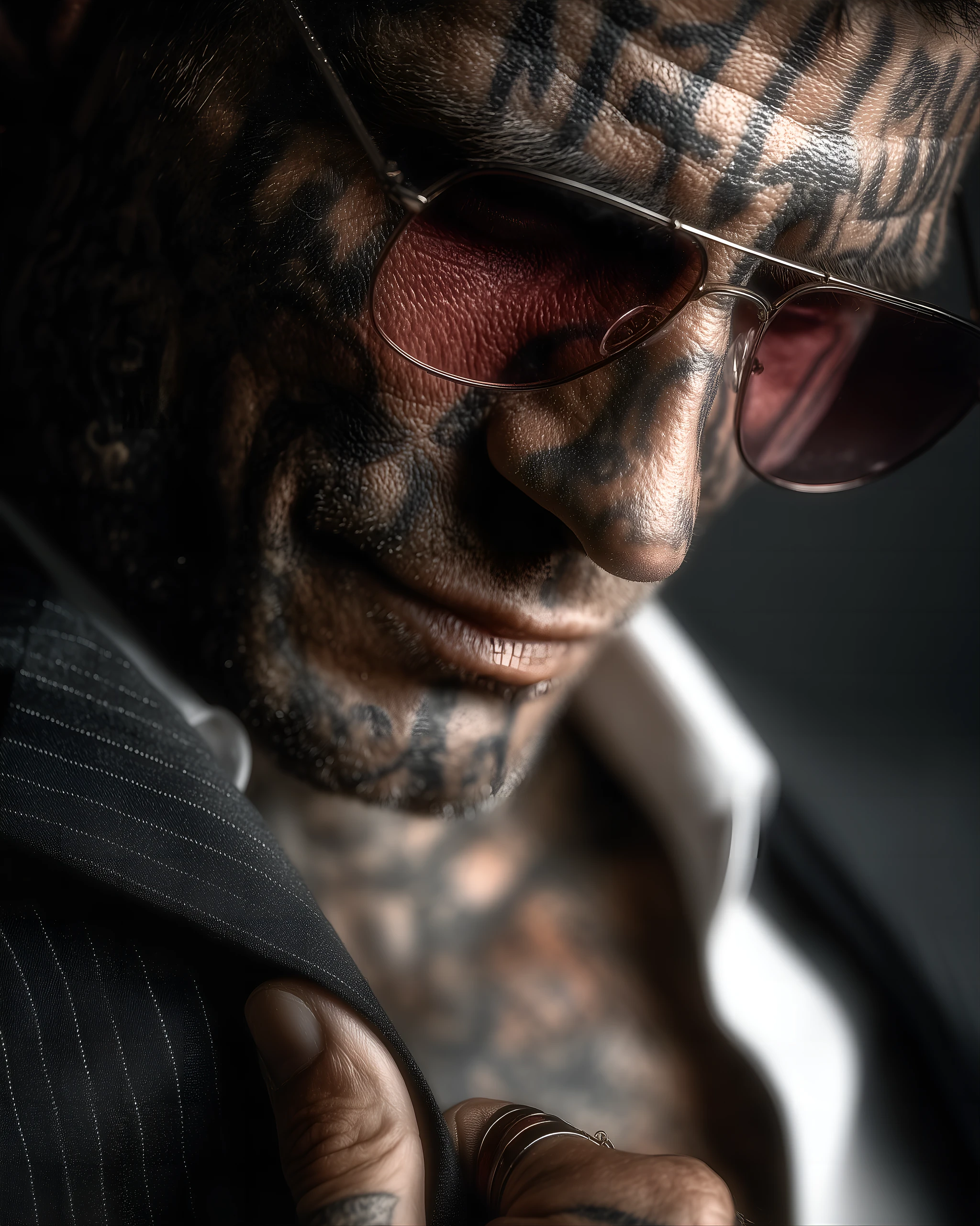 Dramatic Blindfolded Mature Man Portrait: Weathered Skin & Tunic Image Prompt