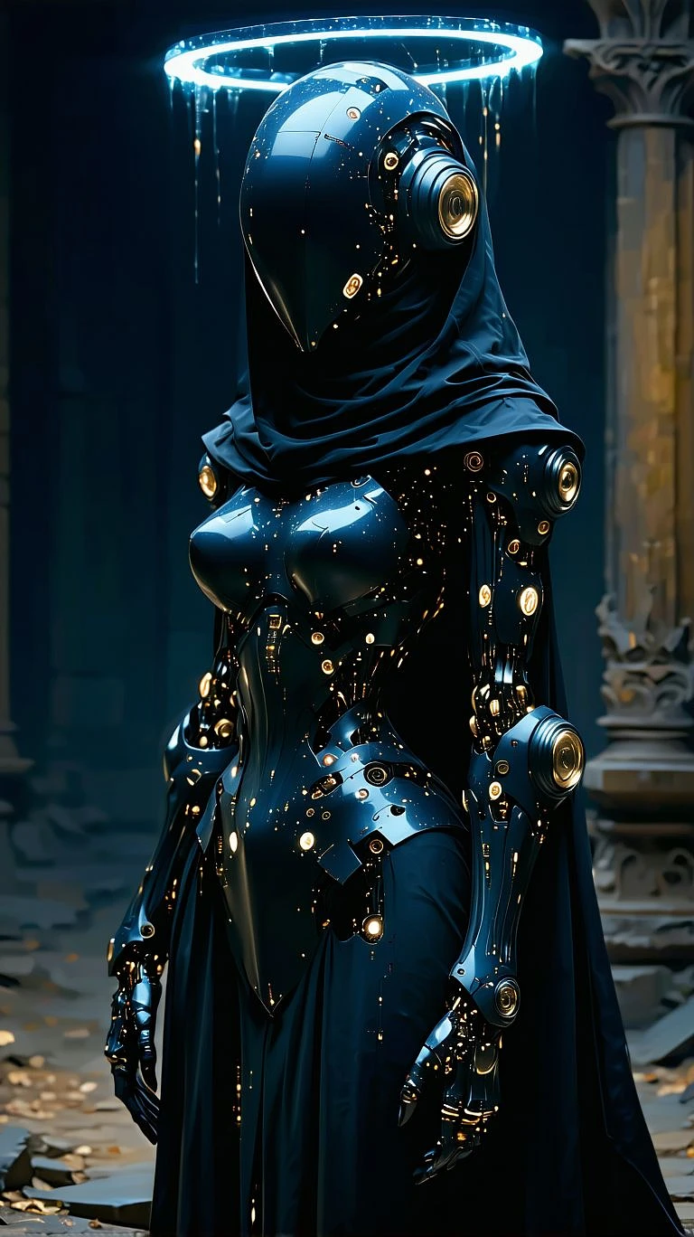 mechanical glowing halo around head . Dark, mysterious, haunting, dramatic, ornate, detailed