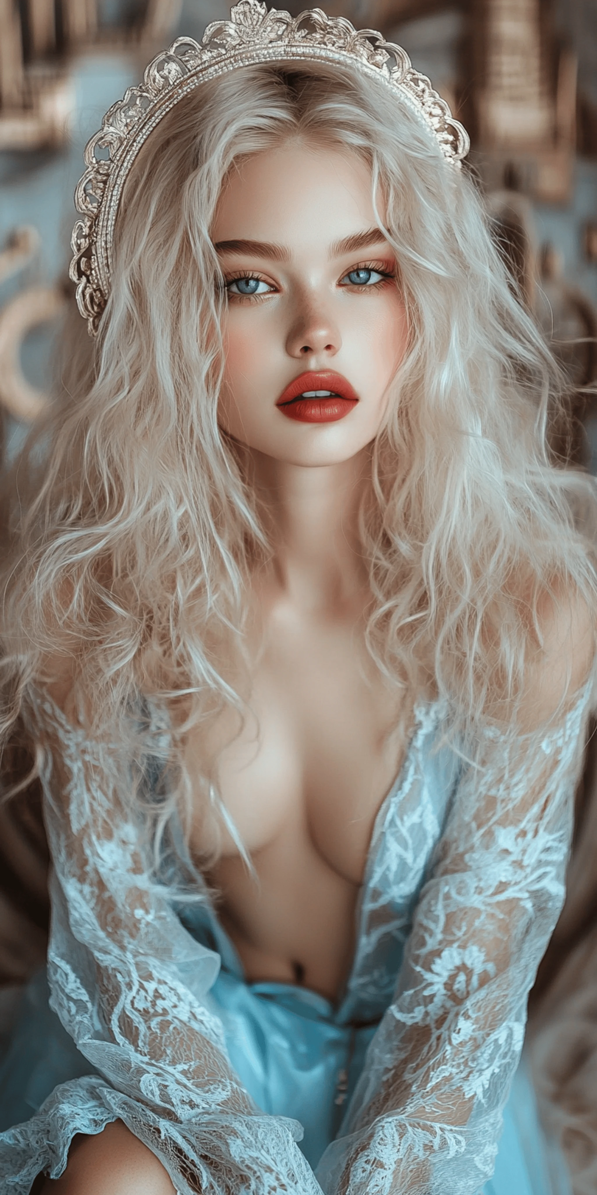 A beautiful, doll-like blonde girl with long, curly hair, wearing an elegant halo and a blue top and skirt, with a background of the Moscow Kremlin. She has exquisite facial features, fair skin, big eyes, blushed lips, and red lipstick. The photo is highly realistic and detailed. --v 6.1
