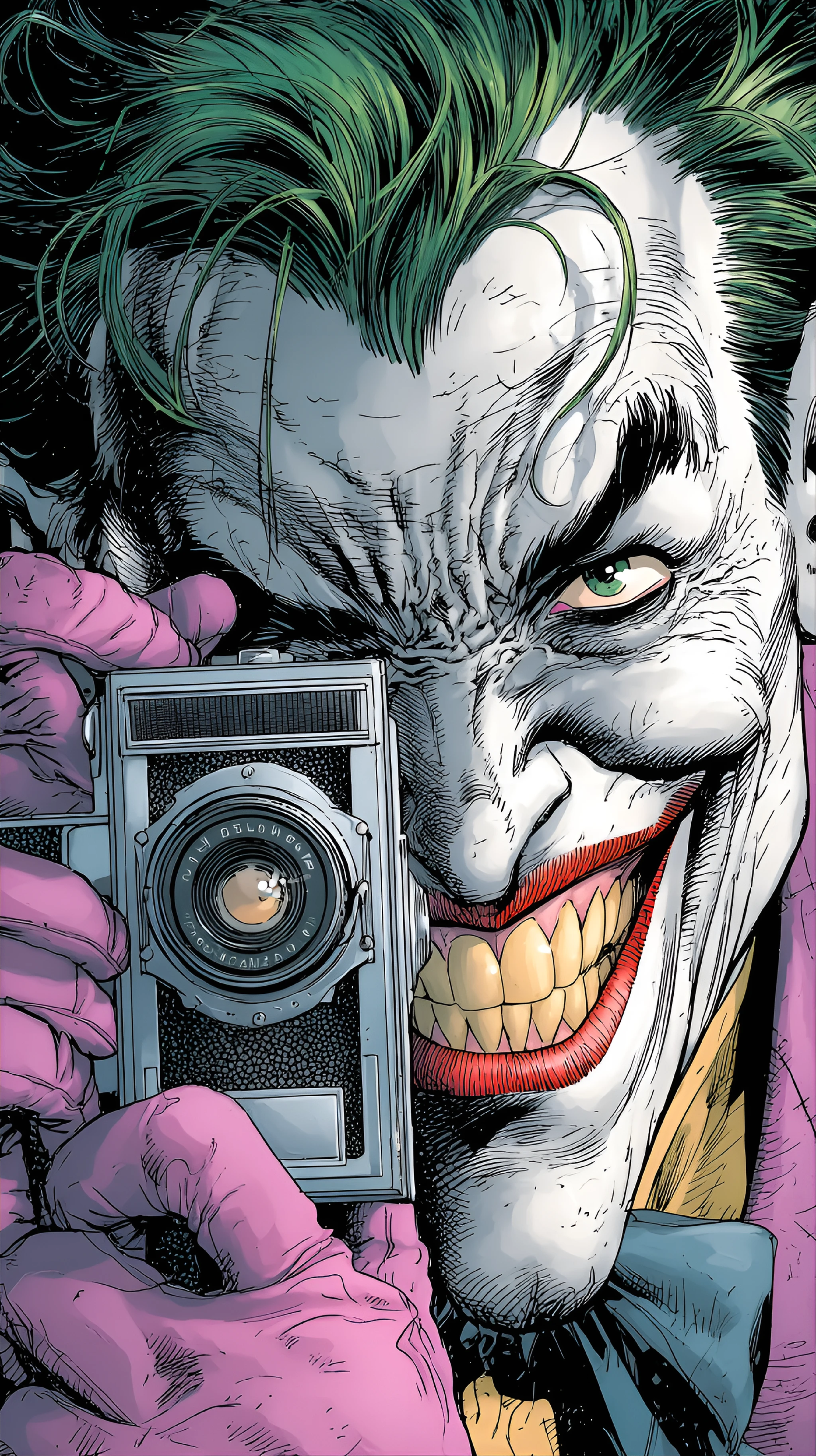 Dynamic comic book illustration of the DC Comics Joker in a close-up portrait. He holds a vintage box camera with visible on its body, positioned as if mid-photograph. The Joker exhibits his iconic appearance: vibrant green slicked-back hair, deathly pale cracked skin, exaggerated crimson lips stretched into a psychotic grin revealing jagged yellow teeth, and wild, unhinged eyes. Art style emphasizes bold linework, high-contrast shading, and flat color application typical of modern graphic novels
