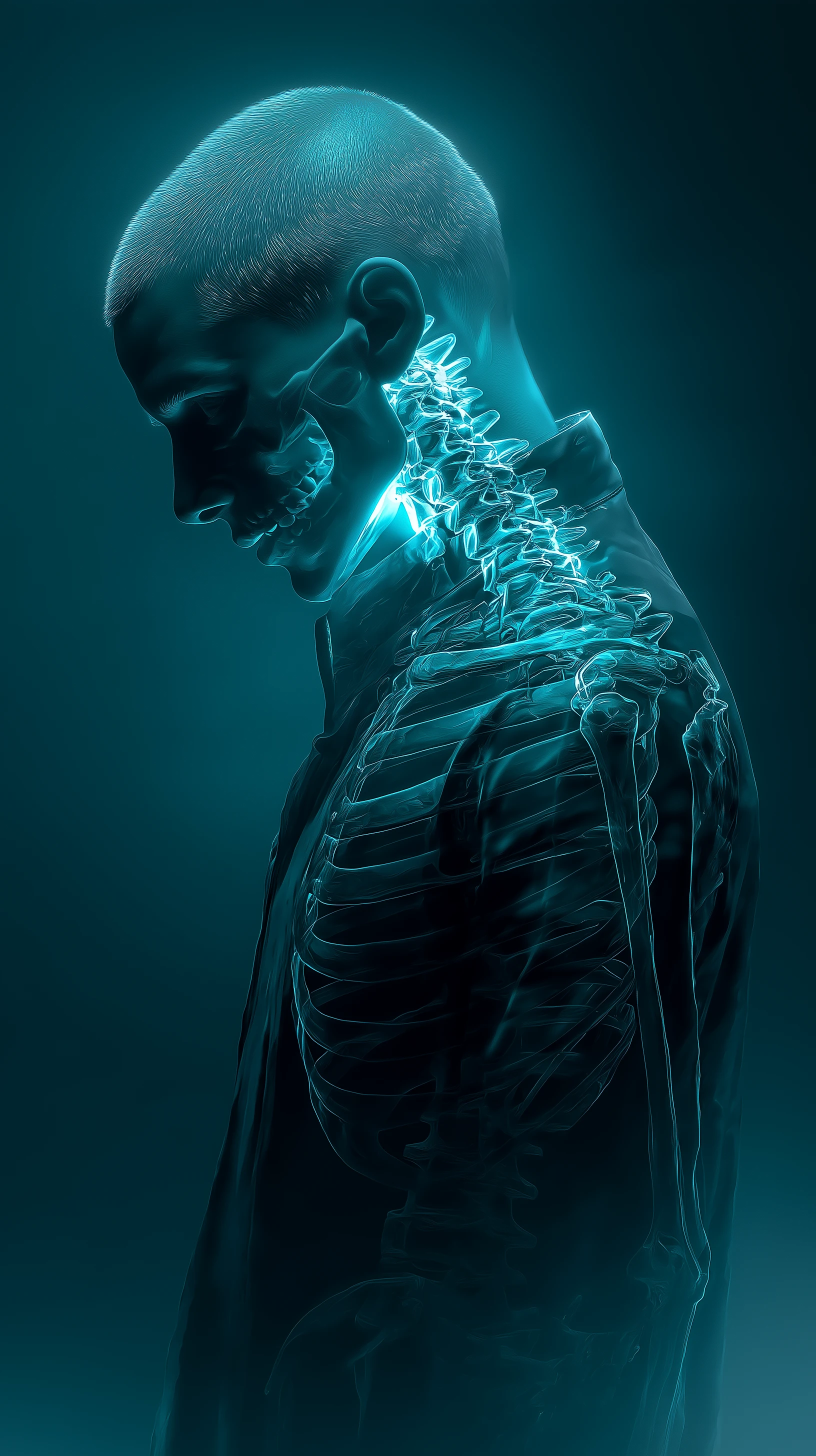 futuristic surrealism, front portrait of a man, side shot, transparent skin revealing her bones, glowing with a neon-blue bio-luminescent effect, minimalist avant-garde style wearing, surrounded by a dark ambient that contrasts with the sharp details of his bones, background is surreal and sci-fi moody with deep fog, lighting is soft with a cool futuristic violet tone, illuminating the skeletal structure subtly, translucent textures, cinematic lighting, cyberpunk aesthetics, x-ray vision, futuristic materials, minimalism and realism --ar 9:16 --raw --v 7