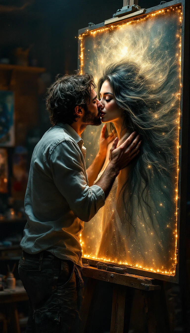 A passionate, surreal moment in an artist’s studio where a rugged male painter, dressed in a slightly worn white shirt and stained pants, leans in to kiss a woman emerging from his canvas. The painting, a stunningly detailed portrait of a beautiful woman with long flowing hair and a textured, ethereal dress, appears to come to life as her face meets his in an intimate embrace.