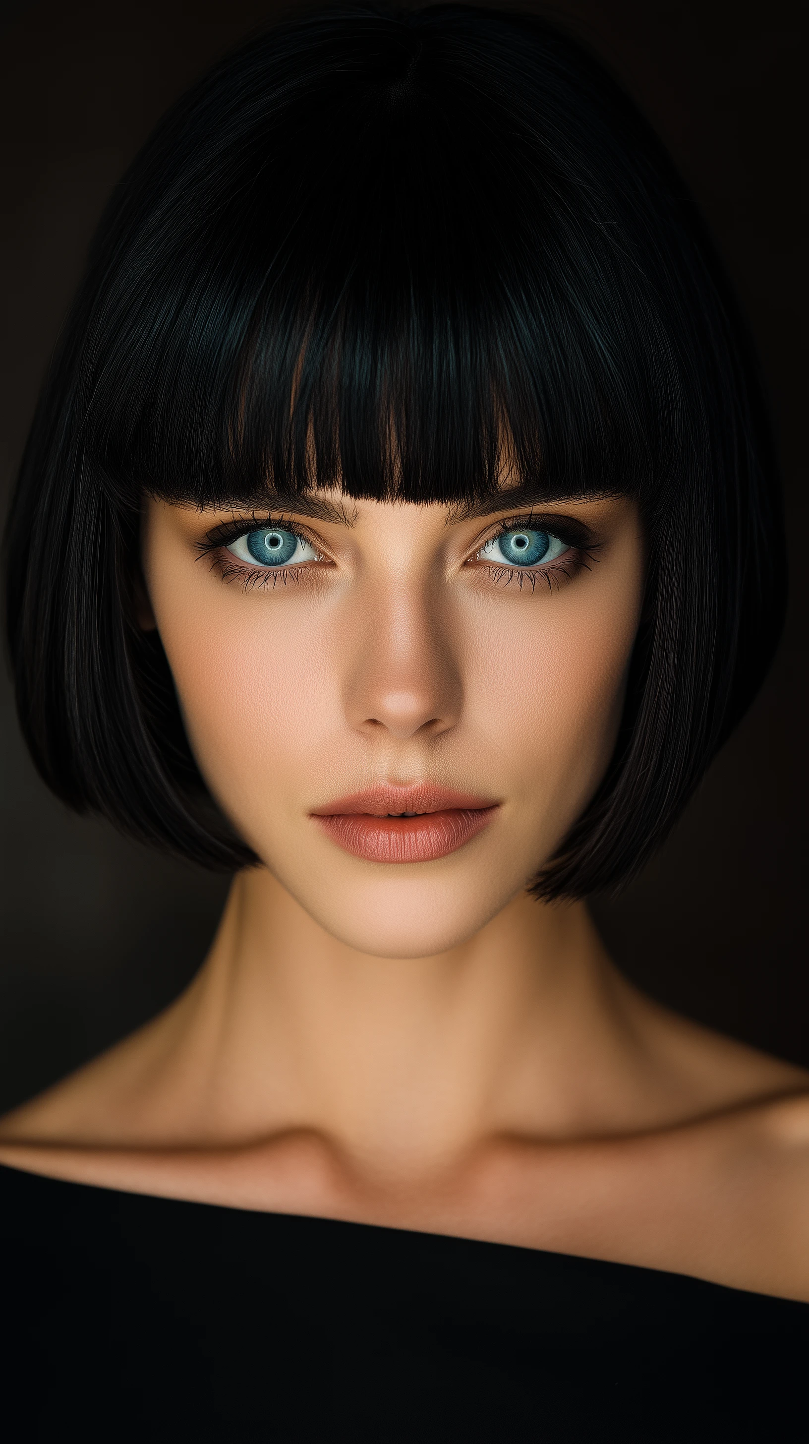 photography, front, upper body, woman, bob hairstyle, blue black hair color, light blue eyes, using Hasselblad H6D-100c medium format, 85mm f/1.4, ISO 100, f/8, 1/200s, soft black seamless background, Profoto D2 lighting setup, light balance emphasizing texture and flow --ar 9:16 --raw