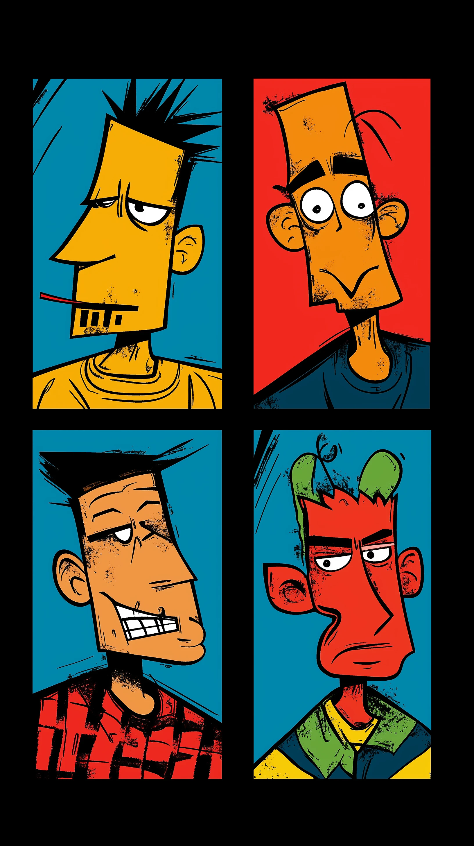 illustration, various four man, square, exaggerated, various each iconic, solid black background, each character different appearance, humorous, flat with bold, colors limited --ar 9:16 --style raw