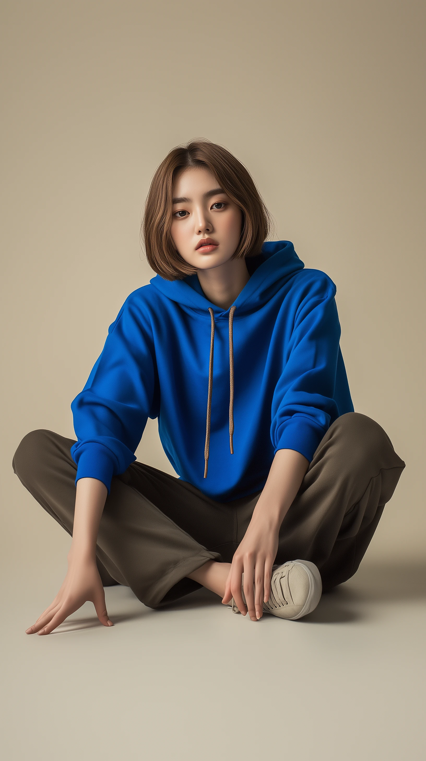 photography, full-shooting, korean female model, natural face, light brown bobbed hair style, gaze, contemporary photoshoot within a minimalist set, model is naturally sitting comfortably on the floor, model is elegantly wearing a vibrant blue loose-fit hoody and dark khaki color capri pants with sneakers, her posture relaxed, neautral background, highlighting, lighting is soft and diffused, casting gentle shadows, 16K, ultra detailed --ar 9:16 --style raw
