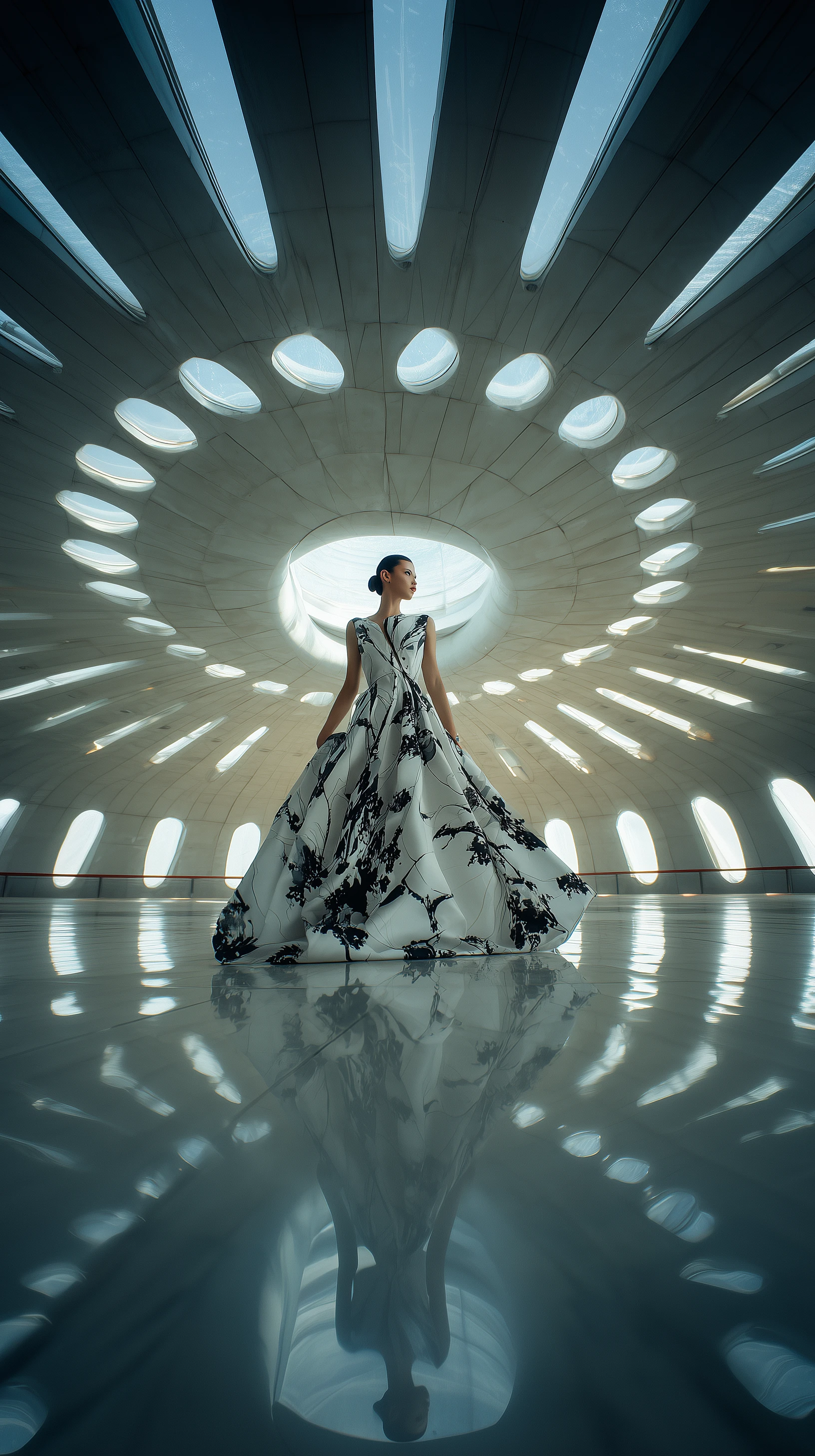 photorealistic, fashion shoot of a conceptual dress model in a gigantic ceiling dome, ambient spotlight, glossy floor reflections --ar 9:16 --raw