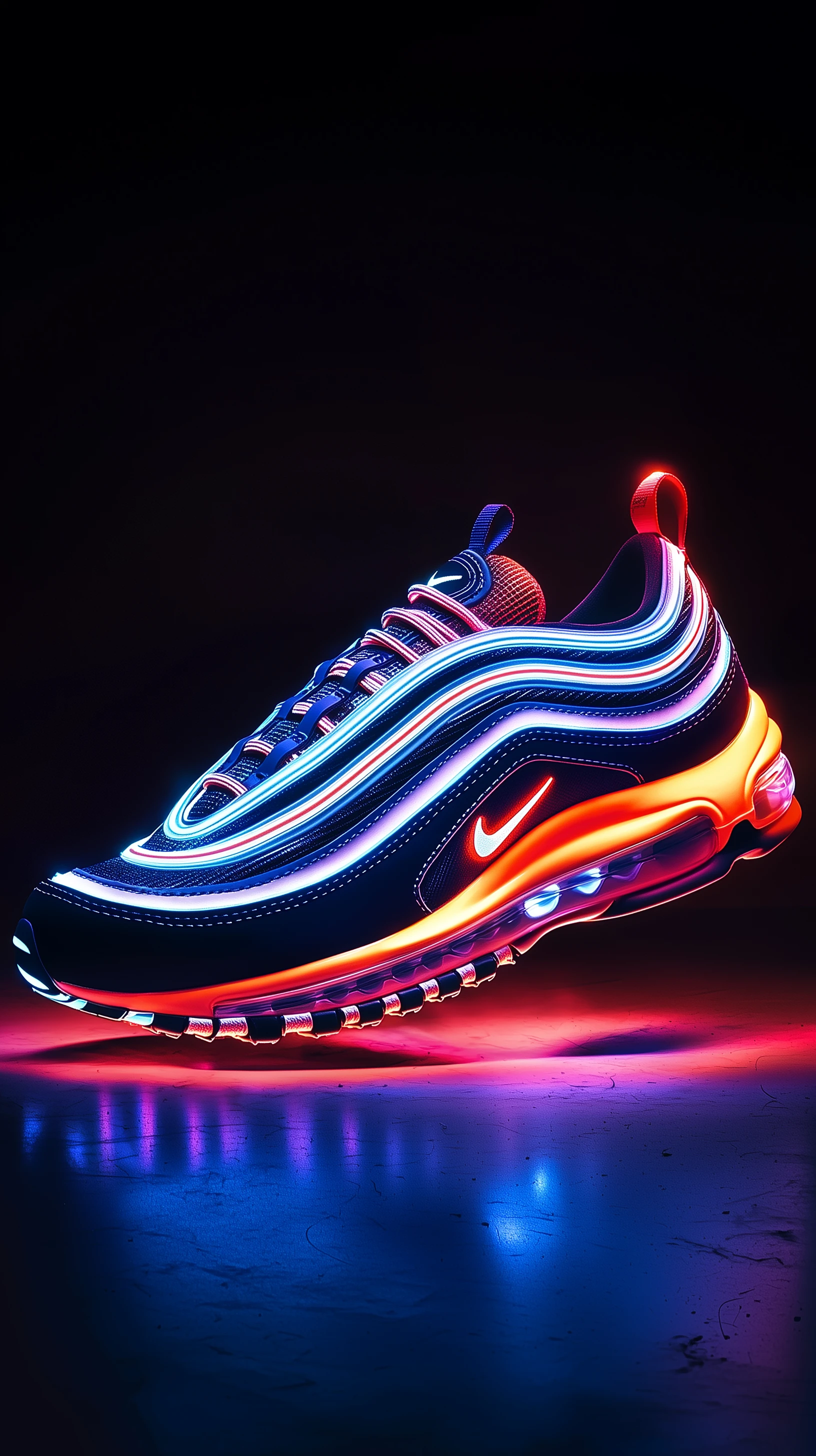neon art, side view, Airmax 97, vibrant color lights, dark atmosphere, 16K, hyper realistic, rich detail --ar 9:16 --quality 2 --style raw