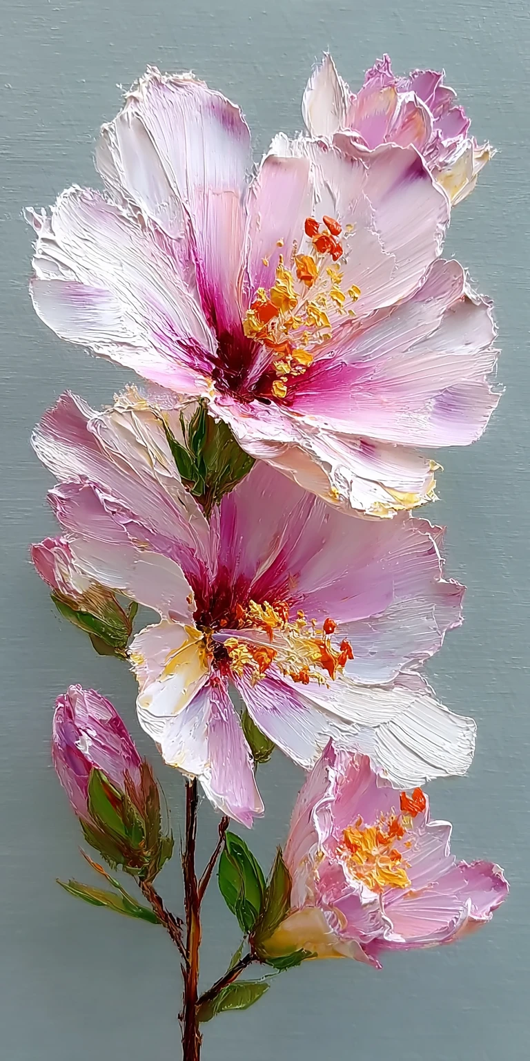 close-up of a Hibiscus tree's large pink flower with petals, painted with a palette knife, heavy impasto --ar 1:2 --stylize 750