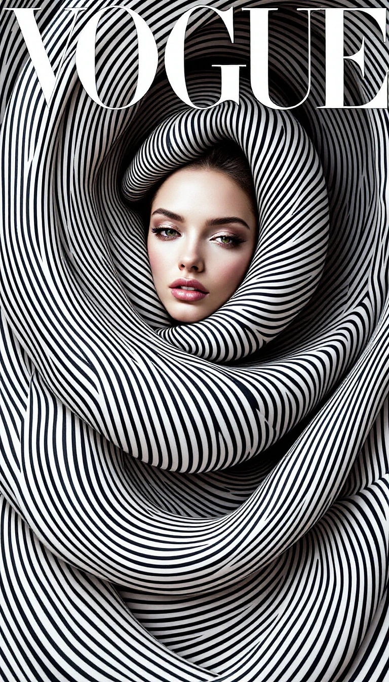 VOGUE magazine cover featuring a mesmerizing woman wrapped in a swirling vortex of stripes. The lines twist and spiral around her, blending her figure into the dynamic, surreal pattern. Her face is calm, partially hidden within the hypnotic waves of stripes, creating an otherworldly, ethereal look. The VOGUE logo in bold at the top, metallic and striking against the abstract design.