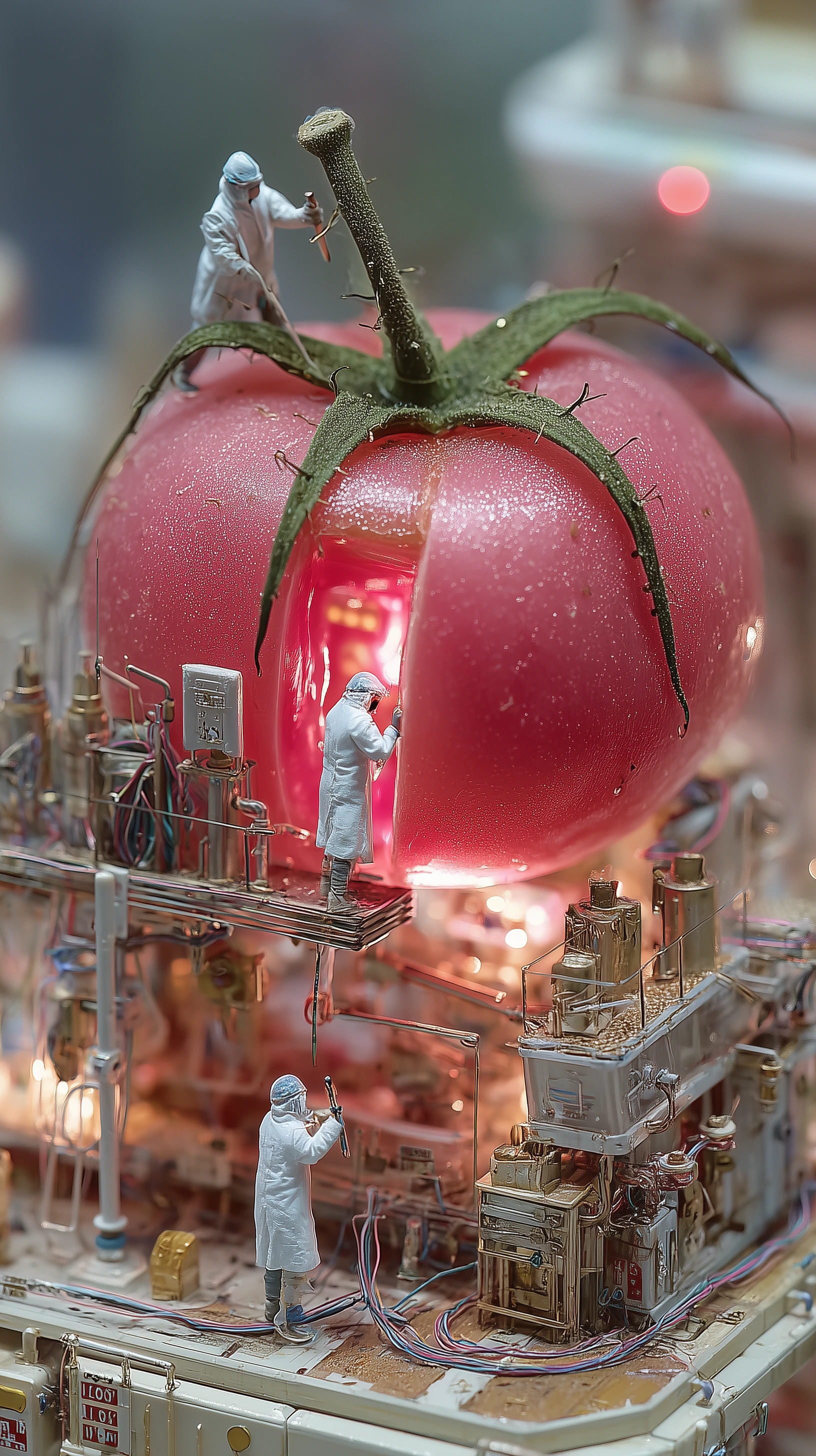 photorealistic, miniature scientists studying, giant tomato, in a lab, depth of field, ambient light, glow lights, intricate scientific equipment --ar 9:16 --raw --stylize 700 --v 7