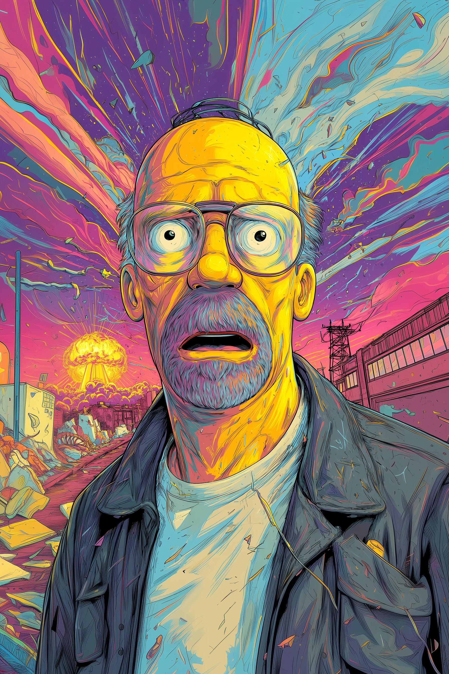 homer jay simpson in GTA illustration, surprised look, site of the explosion of a radioactive power plant, vibrant colors, dynamic composition --ar 2:3 --v 7