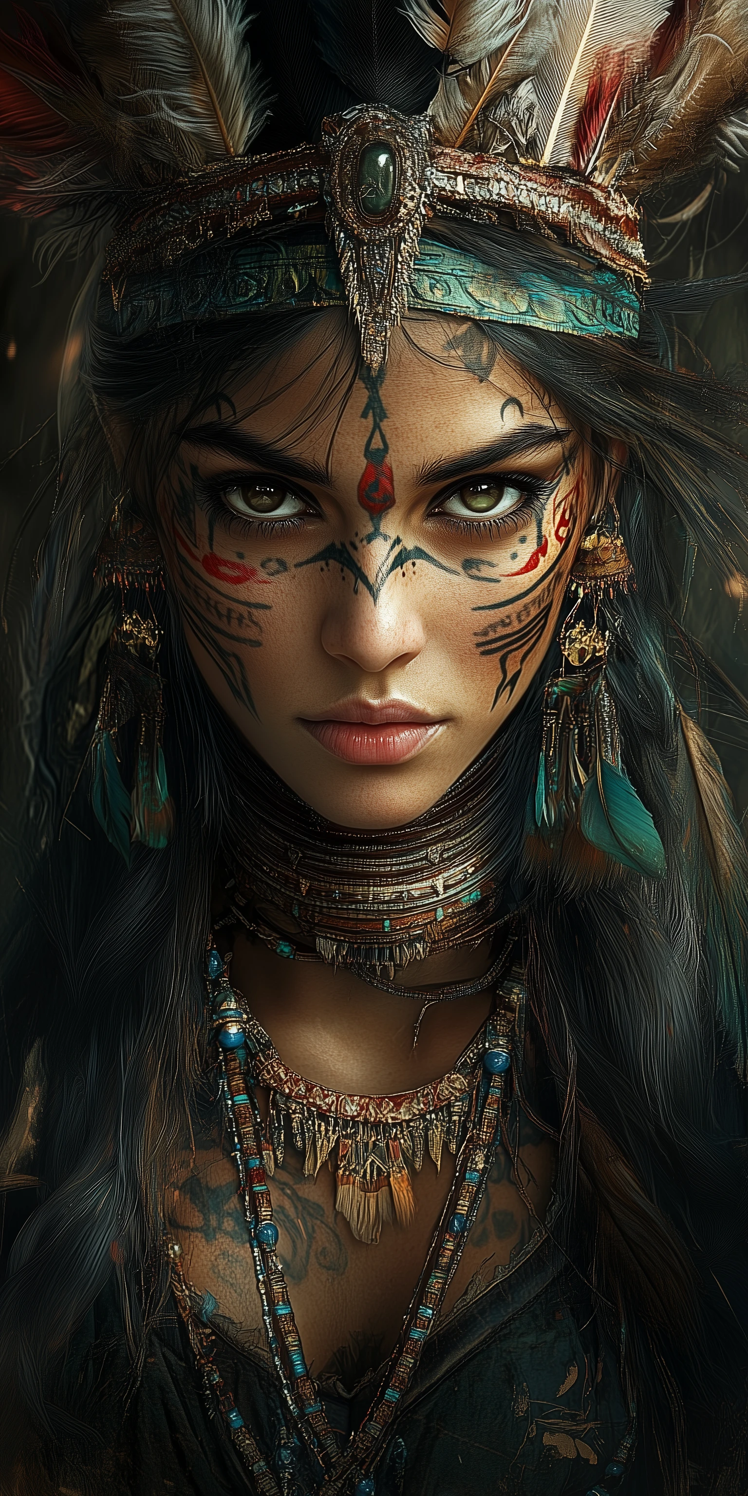 A female warrior with dark hair and facial tattoos, wearing a headdress of feathers, full-body portrait, in the style of digital art. --ar 1:2 --style raw --v 6.1