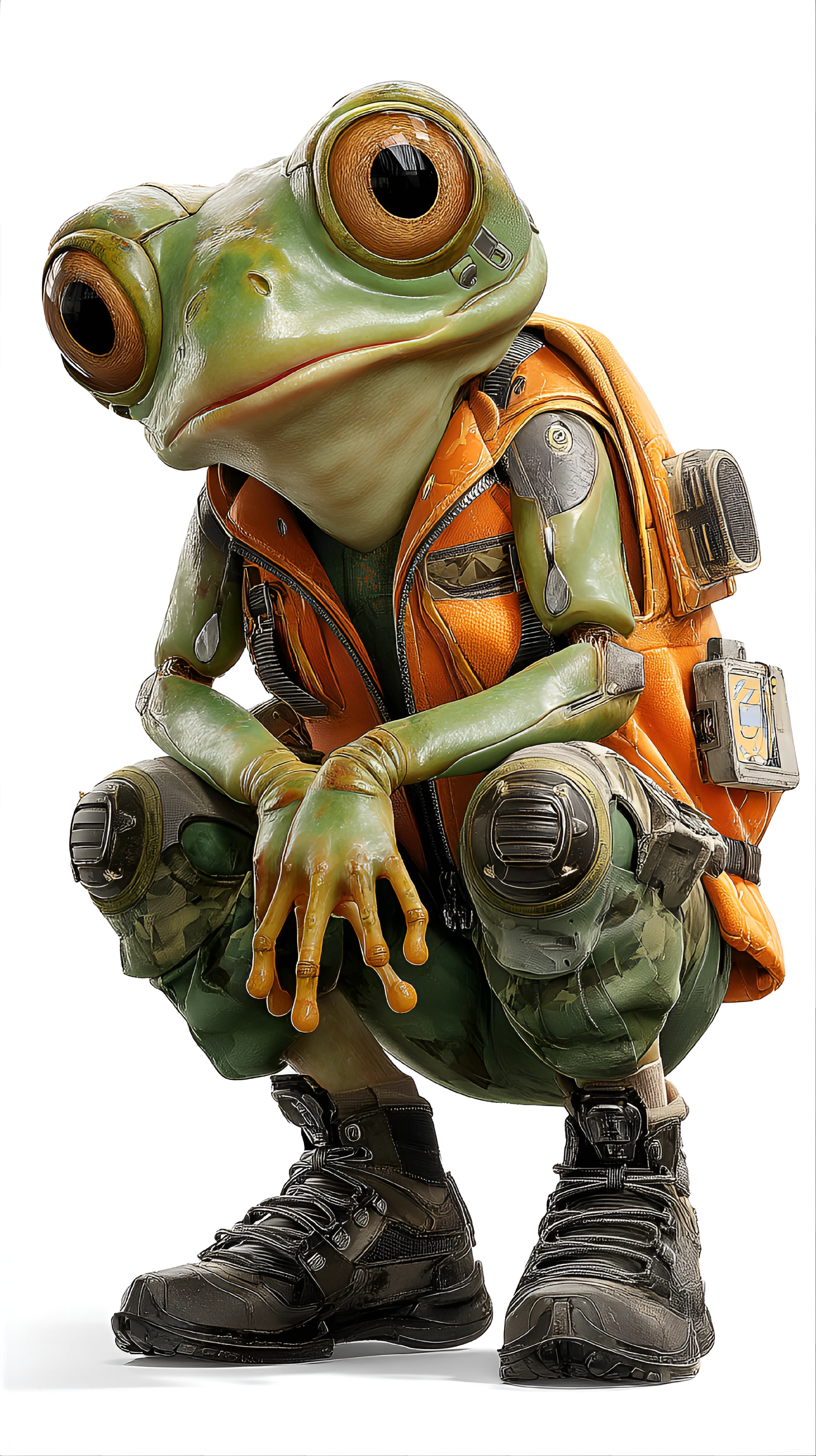 funny caricature, cybernetic amphibian caricature, young alien amphibian, 5 years old in frog years, green skin, bulging eyes, sleek body, big cartoonish head, exaggerated caricature features, curious expression, wearing orange vest, green pants, black boots, no accessories, crouching with gadgets