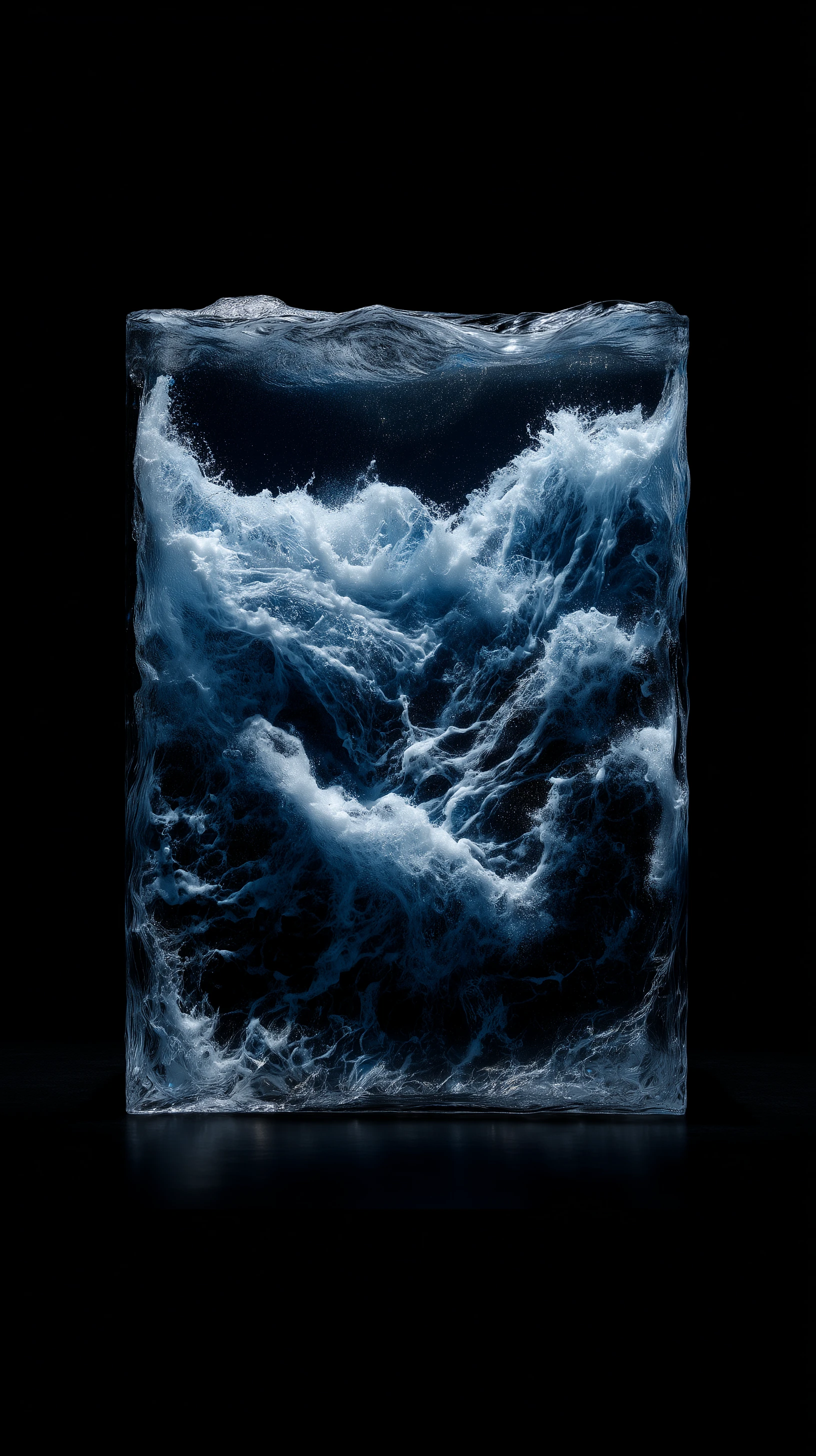 conceptual image, waves in a clear box, solid black backdrop --ar 9:16 --raw --profile f775fdj --stylize 300 --v 7