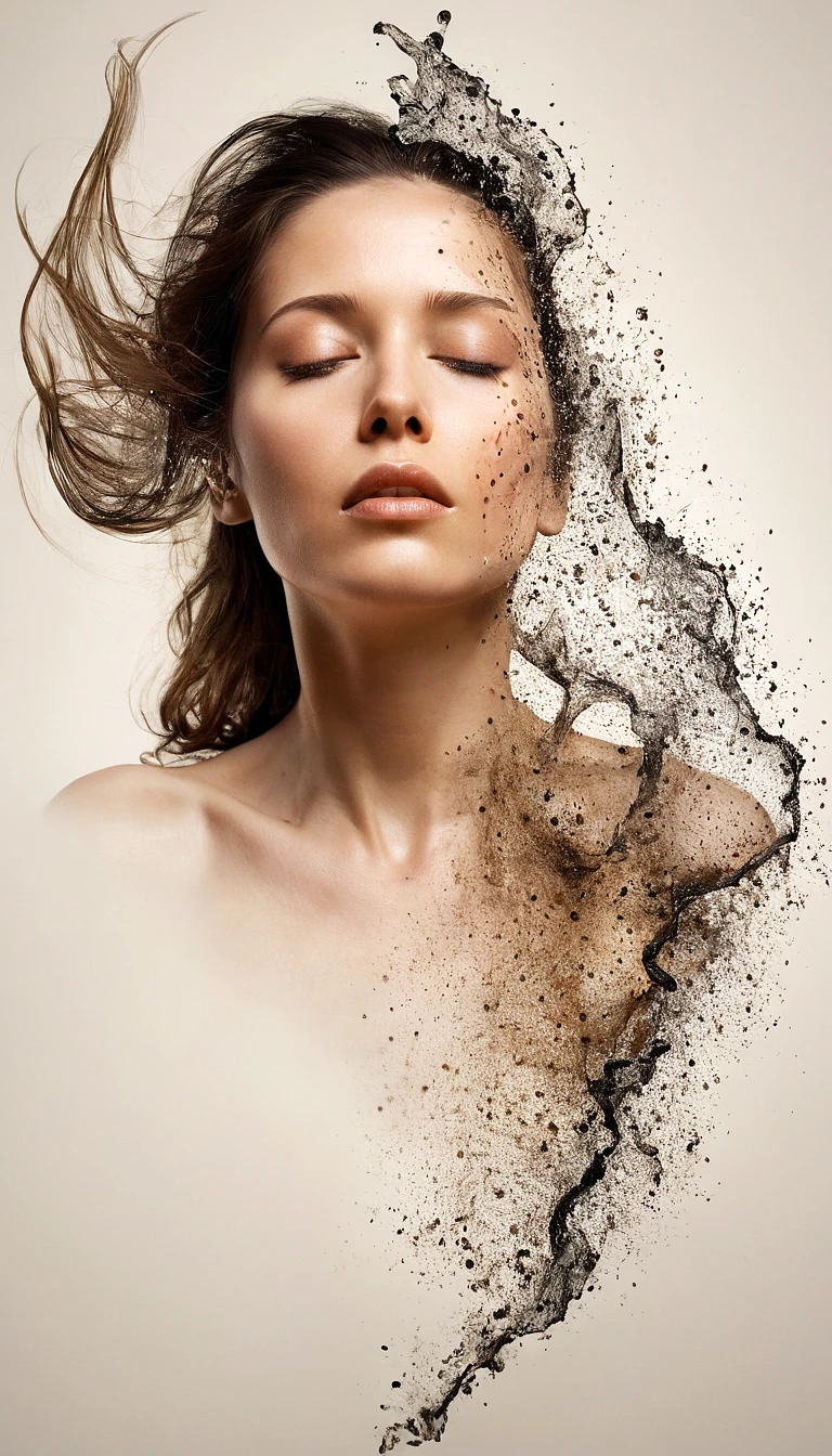 fashion editorial, highly detailed photo, fashion photography, old paper close-up black haired girl with closed eyes in depression and anxiety, portrait, beauty, minimalist, decorative full flowing intricate fine detail, highres, realistic photo, professional photography, cinematic angle, dynamic light back shining,