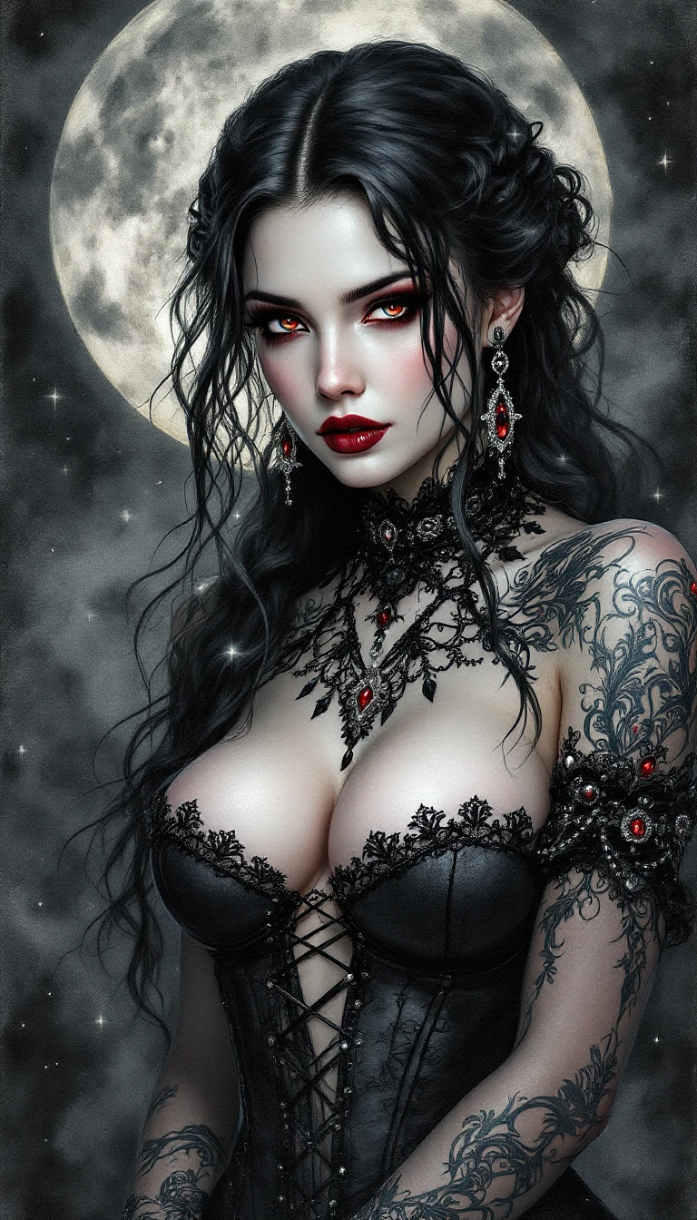 Envision a captivating watercolor portrait of a mesmerizing gothic goddess, her presence commanding the canvas with an air of dark elegance. Picture her adorned in intricate black corsets, lace-trimmed stockings, and other traditional gothic attire, now accented with subtle hints of deep crimson and burgundy that add depth and richness to her ensemble.