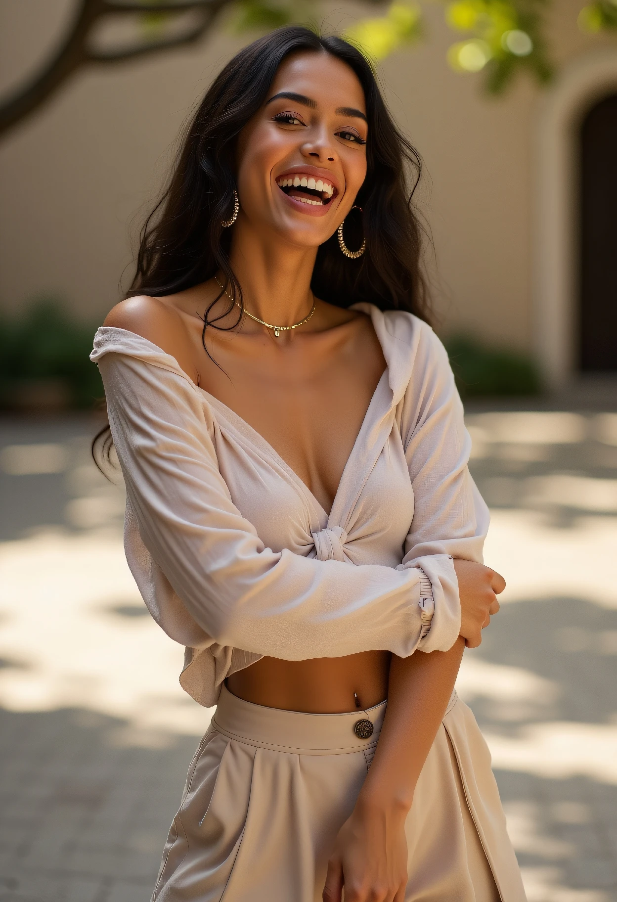 glamour photography, deconstucivist Fashion shot from a distance photo of a 24 year old Mori-Bugis female radiant bride with Uncontrollable laughter expression. Her body is Slender wrists with visible tendons, toned muscles, abs, small breast, flat chest. She has Warm beige skin with a subtle flush across the nose and cheeks. The skin pores and texture are clearly visible and in focus. Her Oval eyes, Hooded, brown eyes, framed by long, elegant eyelashes. Her eyebrows are Defined and full shaped, complementing her delicate facial features. Overly long sleeve shirts with unconventional cuts, midriff, Wide-leg asymmetrical pants with jagged hems, Body angled with arms crossed , rule of thirds, in the background Distorted and overlapping shadows in a courtyard, in the style of Bruce Weber