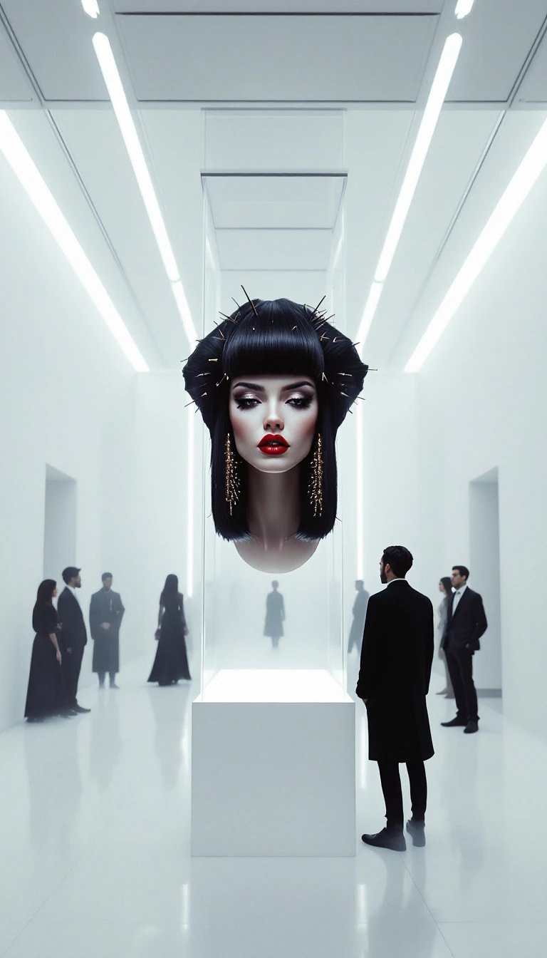 A futuristic museum hall filled with a soft, drifting haze of smoke. The entire space, including the walls and floor, is overwhelmingly white, almost disorienting in its purity. The ceiling is lined with long, continuous LED strips stretching across its entire surface. Their glow is partially absorbed by the swirling mist on the floor, creating an ethereal, diffused lighting effect. The room has no doors or windows, enhancing the surreal and otherworldly atmosphere. At the center of the space stands a minimalist glass display case. Inside, a breathtaking, floating female head is showcased, with bold red lips, editorial-style makeup, dramatic contouring, and shimmering metallic highlighter. She wears an extravagant avantgarde wig with black long textured hair with short fringe. The hair is black and has small metallic pins on it. Sculpted into futuristic, architectural shapes and intricate geometric designs. The head appears suspended in mid-air, as only the hair is fully visible, there is no body, just the striking, levitating form. Surrounding the display, elegantly dressed men and women in avant-garde, high-fashion futuristic attire stand in admiration, capturing the wig with their smartphones. Their outfits feature bold, sculptural silhouettes, reflective metallic fabrics, exaggerated shoulders, high-neck collars, intricate laser-cut details, and asymmetrical designs. Some wear visor-like glasses, glowing accessories, and gravity-defying structured garments. The bright flashes of their cameras reflect off the glass, creating a mesmerizing interplay of light. The scene carries an eerie yet mesmerizing surrealism, blending high fashion, advanced technology, and an air of mystery. The combination of futuristic aesthetics, editorial styling, and avant-garde fashion elements makes the composition feel like a high-end fashion editorial from a distant future.