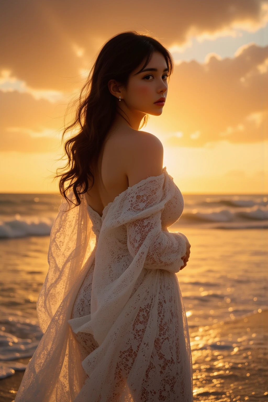 This is a high-resolution, photographically realistic image of a korean woman standing on a beach during sunset. The woman, with long, black wavy hair flowing by breeze, is positioned slightly off-center to the left, facing right. She is wearing a white, off-the-shoulder, lace dress with intricate patterns and a flowing, semi-transparent skirt that billows gently in the breeze. The dress appears to be made of a lightweight, sheer fabric that catches the warm glow of the setting sun. The background features a dramatic sunset with a vibrant orange and yellow sky, transitioning into deep blue hues as it meets the ocean. The ocean waves are visible in the foreground, with their white crests catching the sunlight and creating a shimmering effect on the water. The sand beneath the woman is a light beige, and the overall scene is bathed in a warm, golden light, adding a sense of tranquility and beauty to the image. The photograph captures the interplay of light and shadow, with the woman's silhouette against the glowing sky, creating a sense of depth and movement. The image evokes a serene and romantic atmosphere, emphasizing the natural beauty of the setting and the ethereal quality of the woman's presence.