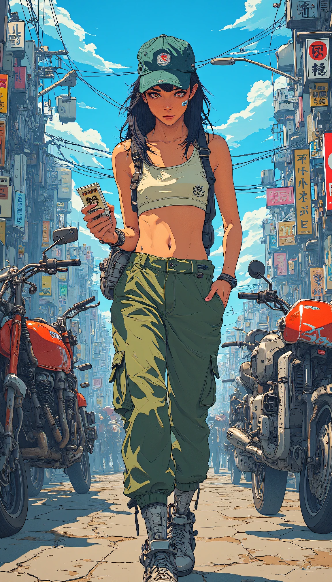 anime artwork A dystopian water courier counts her ration cards in a marketplace, her utilitarian crop top and cargo pants dusty from the road, her defined abs a testament to the physically demanding job of delivering precious water. in style of 'Akira' directed by Katsuhiro Otomo, cyberpunk cityscape, neon-lit streets, futuristic motorcycles, telekinetic powers, government conspiracy, post-apocalyptic Tokyo, Kaneda's iconic red motorcycle, Tetsuo's transformation, psychic battles, massive explosions, iconic pill capsules, cybernetic enhancements, high-tech laboratories, dystopian urban decay