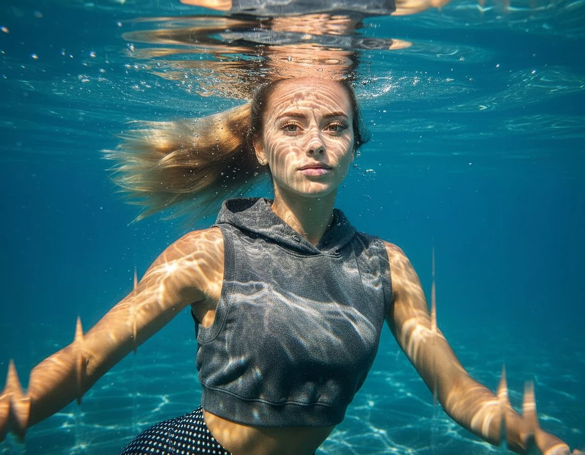 A beautiful girl with big green eyes slanted almond-shaped very cute eyelashes is swimming underwater. The water around her shimmers like glass. The girl's shirt color glitters with light blue, yellow, and blue monochromatic, vibrant, hyper realistic style of photography with intricate details in high resolution, high definition professional photograph. --ar 4:5 --v 6.0