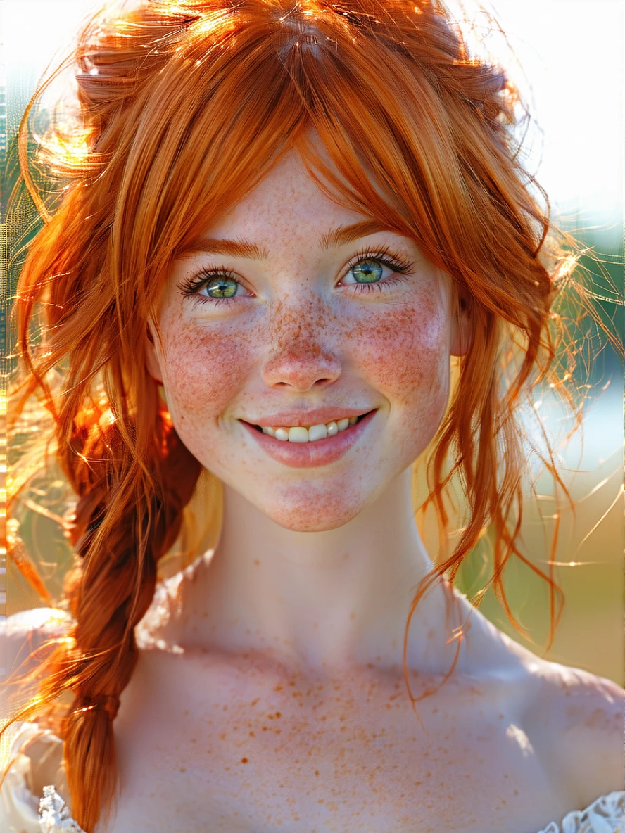 A vibrant redheaded t girl, The young lady's fair, freckled skin is kissed by the sun, giving her an alluring glow that complements her fiery hair. . A mischievous smile graces her plump, glossy lips as she glances at you