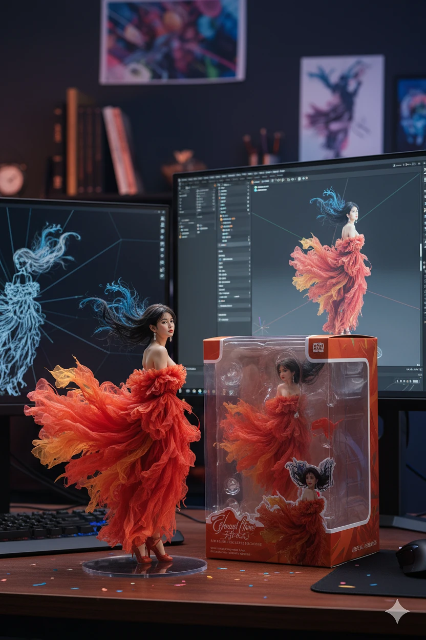 Ultra-Realistic 3D Figurine Creation & Display on Computer Desk with Packaging: 4K High-Definition Image Prompt