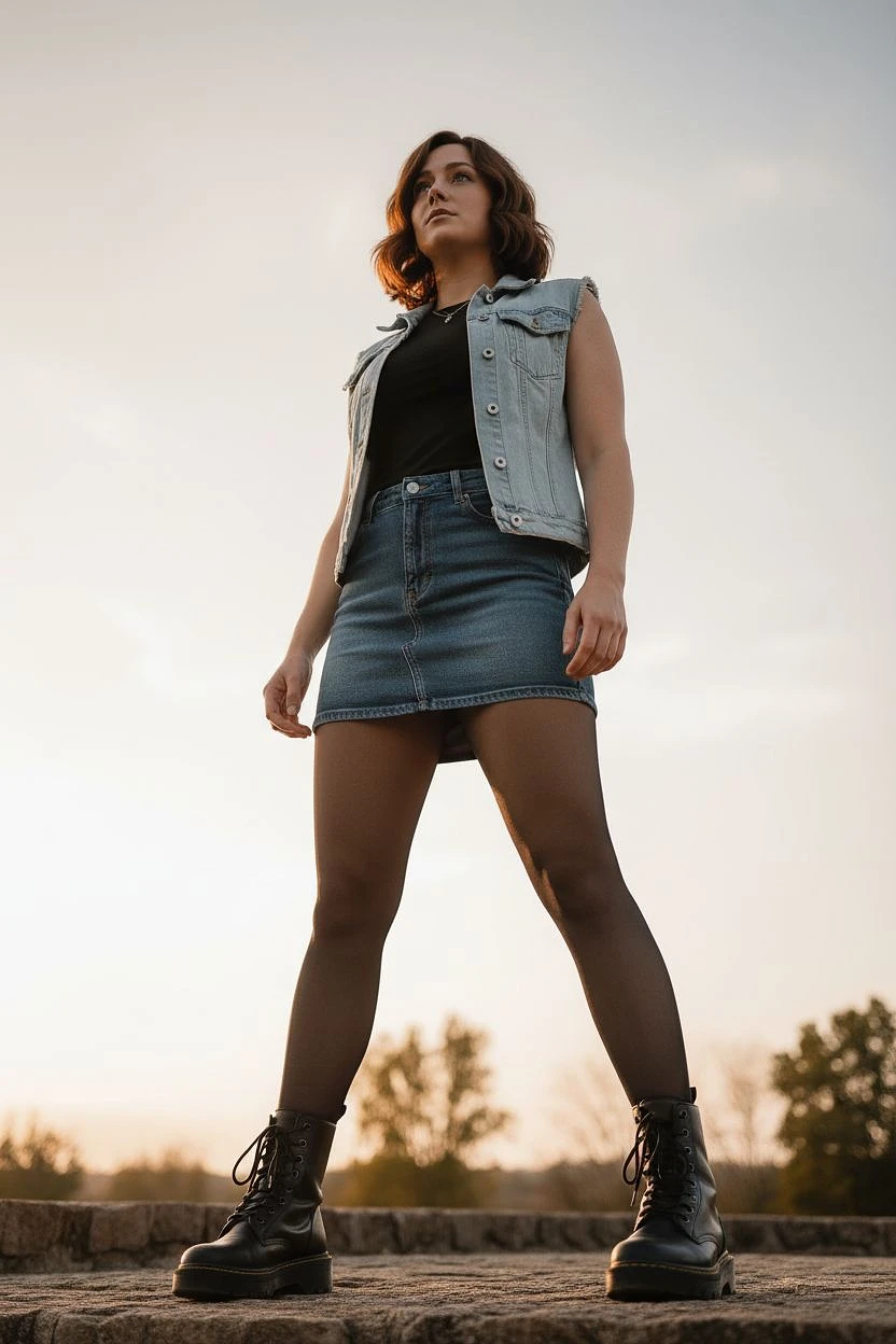 She is wearing a light blue open denim vest, a fitted black sleeveless shirt, a short denim skirt, and black tights. The lighting is natural, with soft light enhancing the textures of the fabric and her skin. The colors are vivid and contrasting, giving her a modern and expressive appearance.hyper-realistic, photorealistic with no cartoon, anime, CGI, or painted effect. Cinematic frame in 2.39:1. Shot with a 50mm lens, shallow depth of field, soft bokeh. Lighting is warm. Color grading with soft tones, desaturated background, dreamy glow using a Pro-Mist effect.