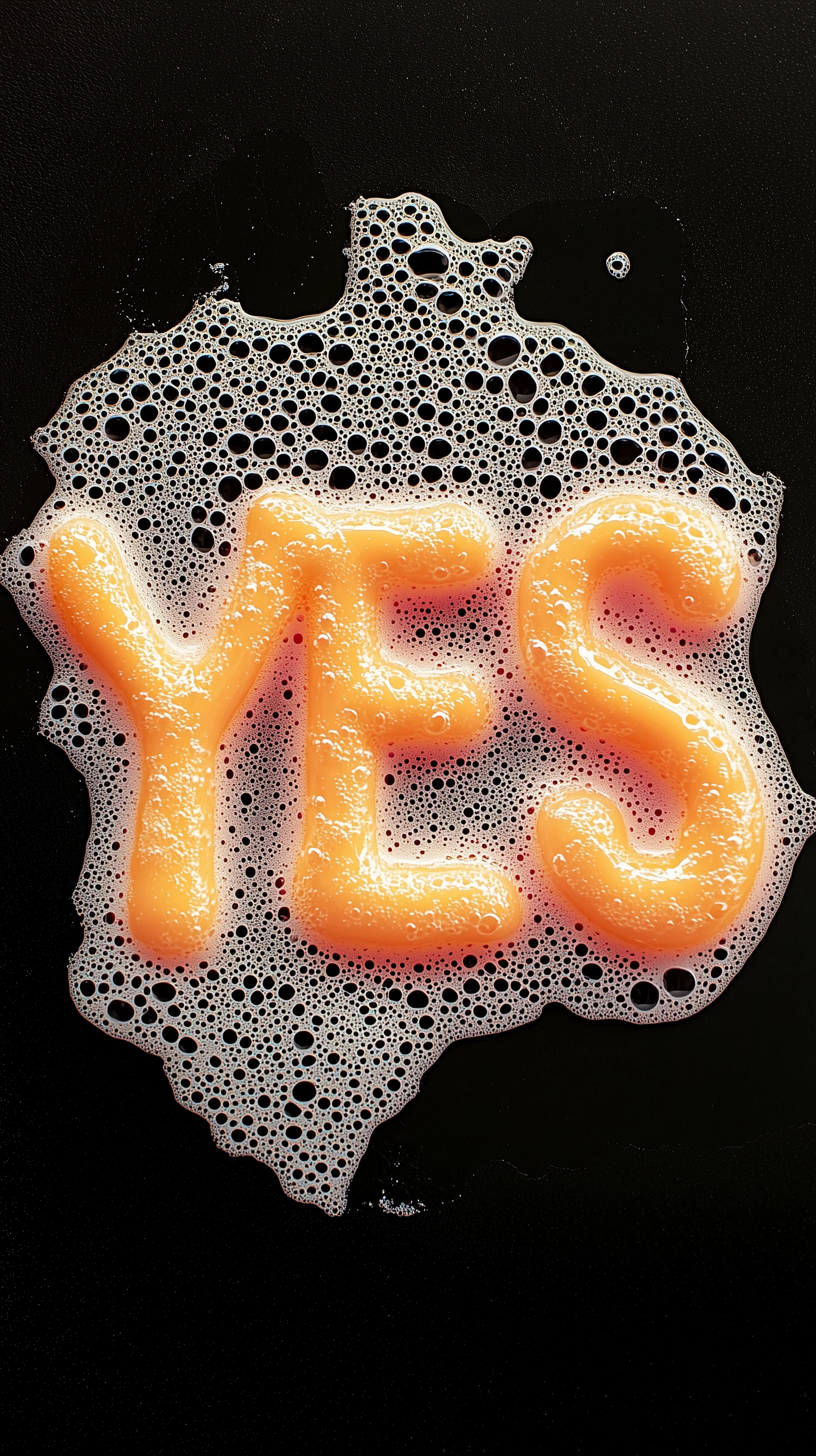 experimental photography, flat lay, form of "YES", orange color bubbly texture, thin soap film membrane, chemical fluid erosion on edges, black background, ultra-detailed foam surface, sharp focus, macro photo of soap bubble --ar 9:16 --q 2 --style raw --v 6.1