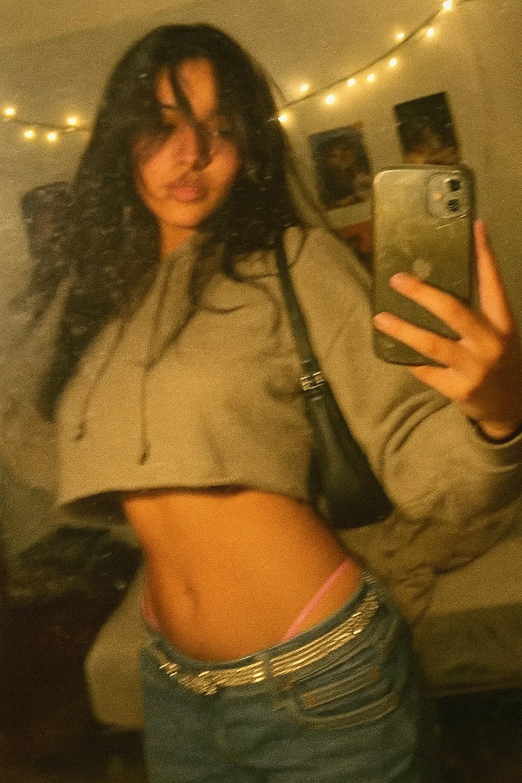 a lo-fi 2010s-era, diagonally taken, low-quality iPhone photo of a 20-year-old baddie. The shot is imperfect — grainy, off-center, motion-blurred, and raw. The lighting is uneven and yellowish, like a flash bounced off a mirror or cheap LED strip. She’s captured head-to-hip, wearing a cropped hoodie and low-rise jeans with a rhinestone belt and playfull tanga peeking, a tiny purse hanging off her shoulder. Her long dark hair partially covers her face as she moves mid-pose, expression unreadable.