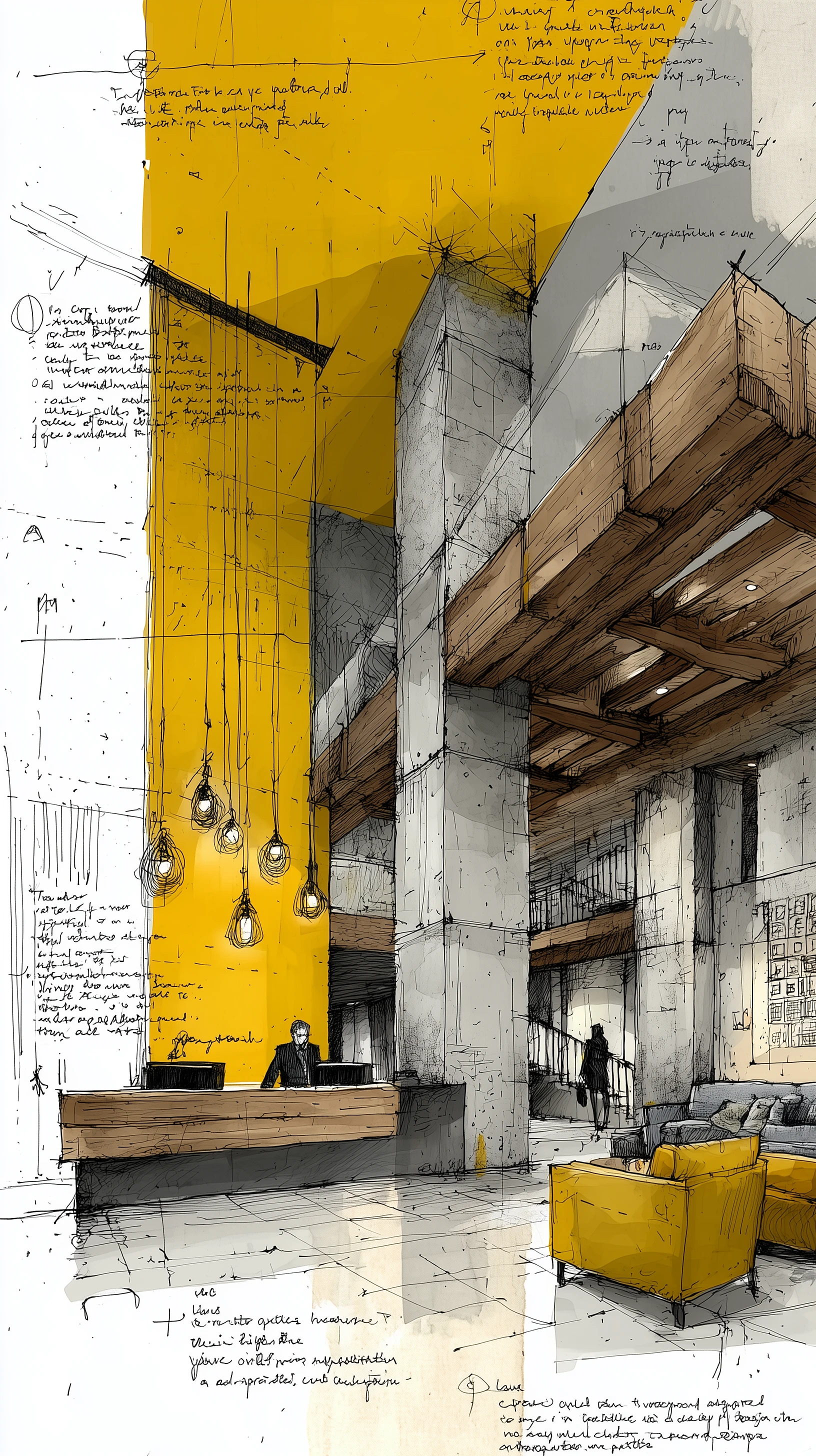 hand drawing, architectural brutalistic hotel lobby interior, featuring a alignment lines and yellow with grey color wall, concrete expression, wooden ceiling, variety person, simplify and minimalist, ideation, guide line with finished material text, bold lines, white background --ar 9:16 --raw --stylize 300 --v 7