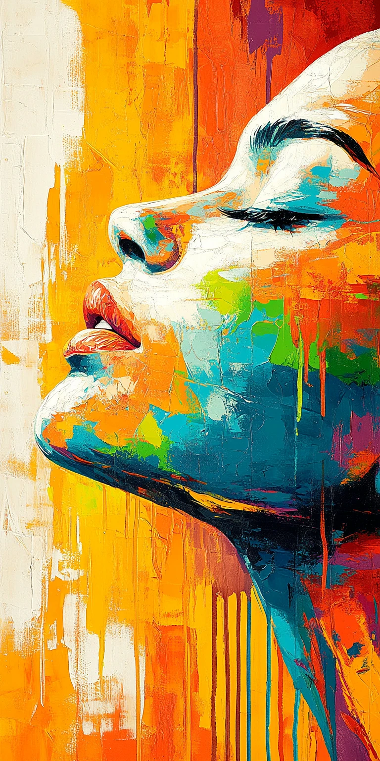 Painting on canvas of a woman in colorful tones, in the style of Martin Ansin, cracked, serene faces, paint dripping technique, gorgeous colors, geometric --chaos 75 --ar 1:2 --profile rsy6uq9 --stylize 750