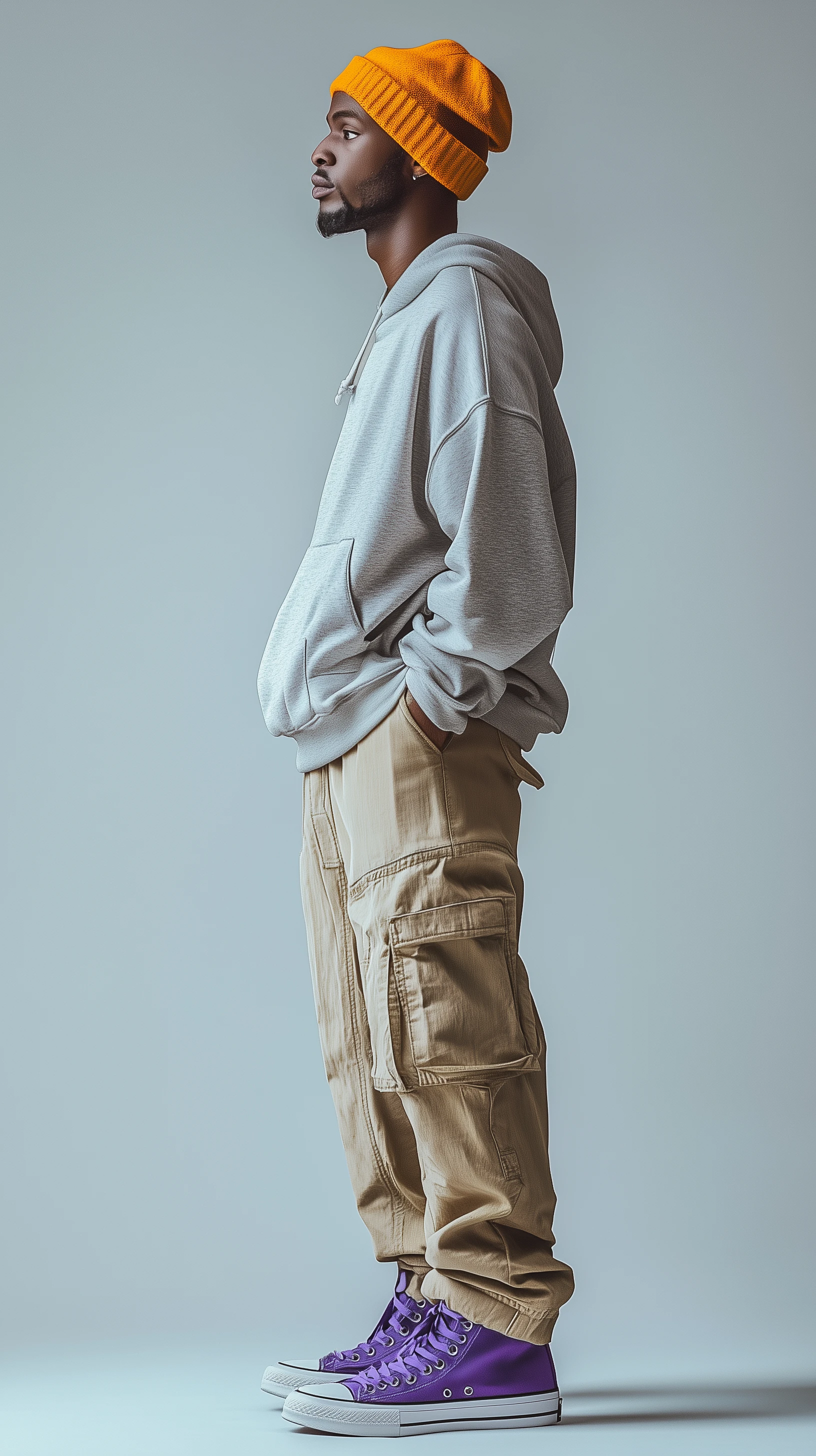 streetwear fashion editorial, full-body, man in profile, wearing a mustard yellow color beanie hat, oversized grey sweatshirt, wide khaki cargo pants and purple converse sneakers, clean studio background, soft diffused, relaxed posture, realistic, rich detailed --ar 9:16 --style raw --stylize 500