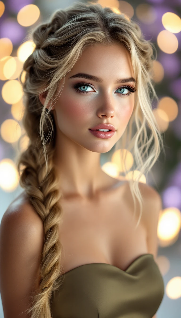 A stunning young woman with flawless porcelain skin and long, golden-blonde hair styled in a thick, elegant braid. Her piercing, icy blue eyes shine with soft light, framed by shimmering eyeshadow and perfect makeup that highlights her ethereal beauty. Her lips are full and naturally pink, and her expression is calm, serene, and captivating.