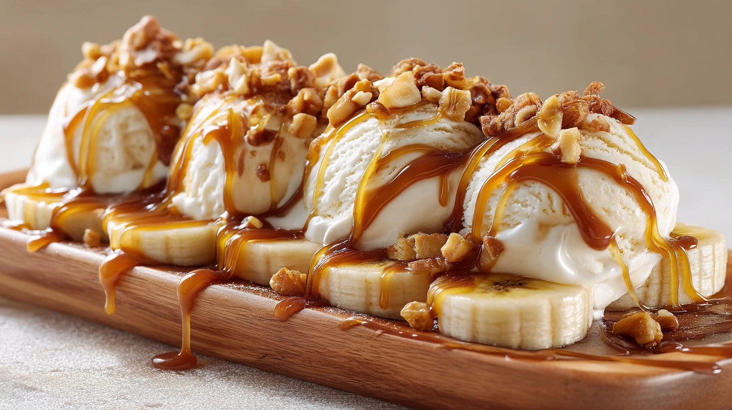 Banana split dessert, close-up, three scoops of vanilla ice cream layered on sliced bananas, drizzled with caramel sauce, nuts visible on top of ice cream, wooden serving dish, light beige background, appetizing, sweet, rich, smooth caramel sauce, detailed texture of banana slices, creamy ice cream, close-up perspective, food photography, delicious, dessert, close-up, high detail, detailed, realistic, smooth, creamy, appetizing