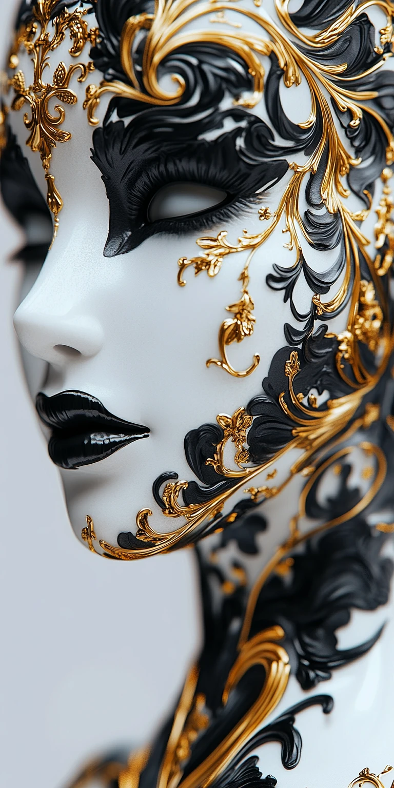Close-up of an ivory mask with black and gold floral designs, white background, glossy magazine-style photography, hyper-realistic, beautiful lighting, intricate details, highly detailed, ultra-detailed, ornate patterns, cinematic, in the style of Octane Render, in the style of Unreal Engine 5. --v 6.1