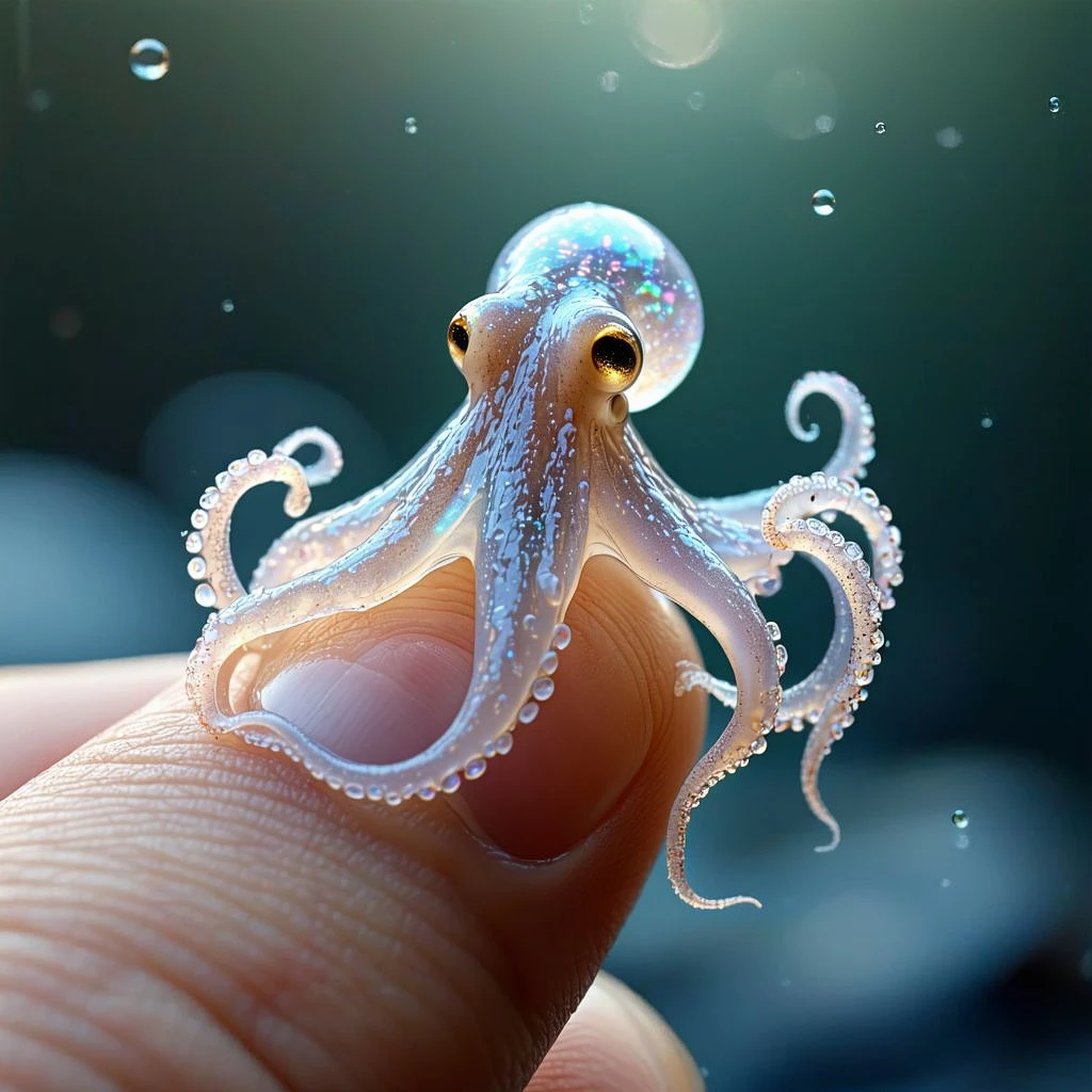Hyper-realistic digital rendering of an impossibly tiny translucent octopus perched gently on a human fingertip. The octopus, no larger than a pea, has a semi-transparent, iridescent body reflecting hints of pink, blue, and lavender. Each of its miniature tentacles is covered in microscopic suction cups that cling lightly to the fingertip. Its large, intelligent eyes shimmer with golden hues, and its delicate, fluid form appears almost weightless. The background features an out-of-focus underwater seascape with ethereal blues and greens, accented by soft floating particles and a mesmerizing bokeh effect of diffused light. The image captures the harmonious blend of photorealistic detail and fantastical proportions, making the tiny cephalopod appear magical yet entirely lifelike.