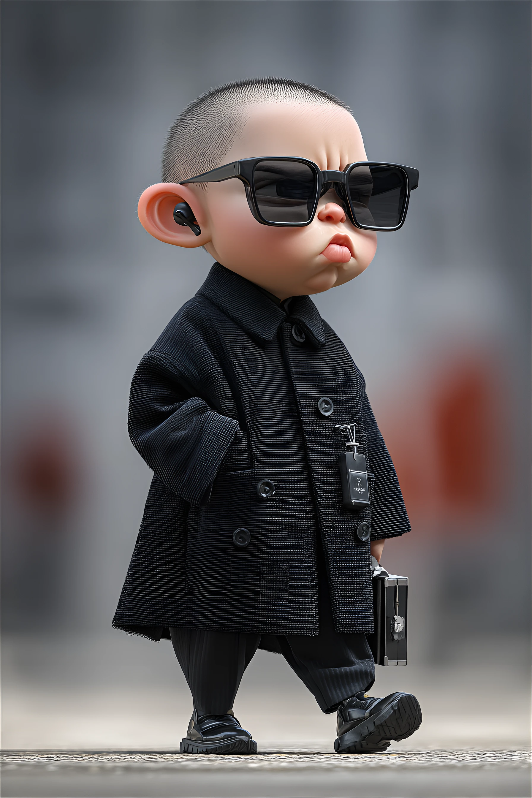 funny caricature, tiny secret agent character, male, 2 years old, serious, determined, miniature, exaggerated large head on a tiny body with oversized sunglasses, diminutive body type, hidden eyes, pouty lips, chubby cheeks, stern expression, the tiny secret agent is wearing a black trench coat and dark sunglasses, accessorized with an earpiece and tiny briefcase, confident stride pose, blurred background