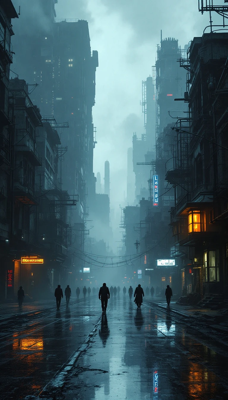 with a futuristic city and industry complexes, a sense of fog wafting in the surroundings, people with lifeless empty gazes wandering aimlessly around, world has become a machine, life has become a machine, existence has no value anymore, night scene, after rain, wet streets, reflecting lights, neon lights, dark, mysterious, haunting, dramatic, ornate, detailed, 8K--v 4