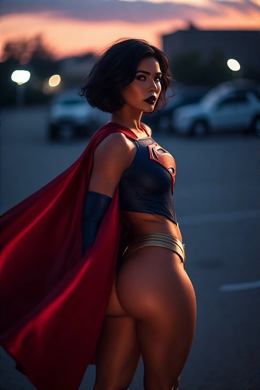 photo of supergirl in a supergirl costume with a red cape on her back, black hair, short hair, tan skin, makeup, dark lips, standing in a city parking lot at night, dark background, sunset, detailed skin, detailed eyes, depth of field, 8k uhd, dslr, dim lighting, high quality, film grain, <lora:Sasha Calle:1>, full bode, fitness,