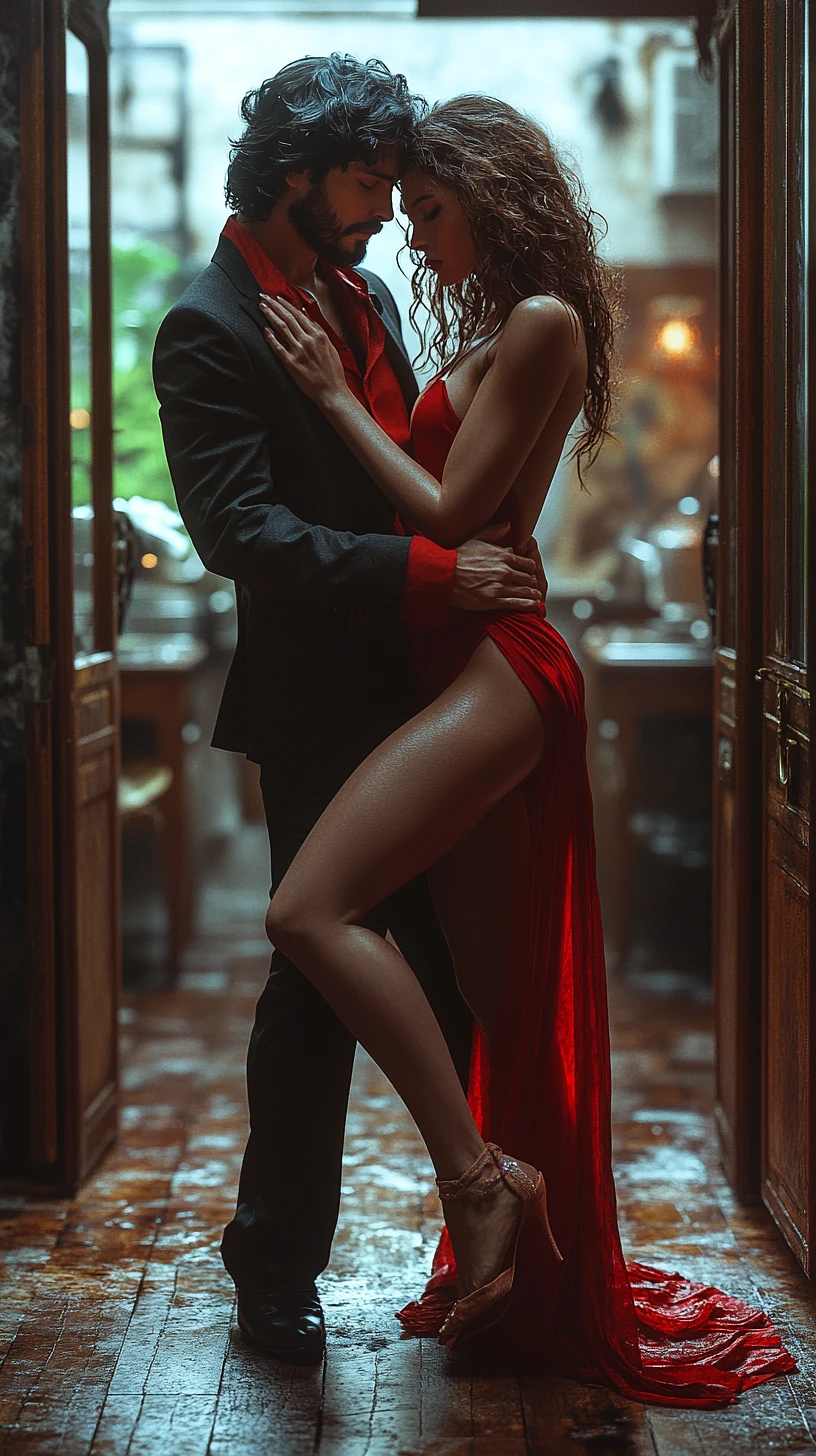 A passionate Argentine tango couple in a dramatic dance position. The man wears a sharp black suit with a deep red shirt, leading with intensity. The woman wears a flowing red long dress with a thigh-high slit, her leg extended elegantly in a classic tango pose. Their bodies are close, eyes locked, exuding high passion. The dimly lit wooden dance floor reflects warm, moody lighting, with a smoky, intimate tango club ambiance in the background. Hyper-realistic, cinematic lighting, dramatic shadows, highly detailed textures, ultra HD, 8K.