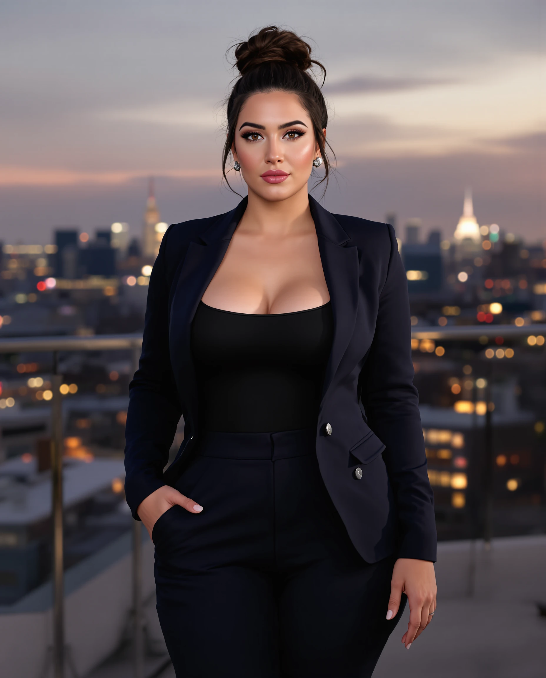 (wearing a dark navy fitted blazer over a sleek bodysuit, paired with high-waisted tailored pants, structured fit emphasizing proportions, standing on a rooftop lounge with a softly glowing skyline, balanced city lights, front view, smooth lighting accentuating form and facial details:1.2).