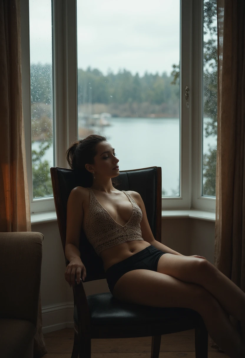 A woman reclines in a chair, surrounded by the soothing calmness of a peaceful scene. She wears a tight low-cut neckline crop top that showcases her toned physique, with an open knit design that seems to add a touch of whimsy to an already captivating image. A pair of tight black shorts seem to hug her legs in all the right places, adding a sensual touch to an already breathtaking scene. Her light makeup seems to blend seamlessly into the background, like a whispered promise that's been shared with no one. She sits in front of a large bay window, which frames the serene beauty of a lake and forest background. The cloudy sky above seems to be raining gently, casting a soft and cozy atmosphere over the scene. A layer of condensation or dew clings to the windowpane, like a secret that's been shared with just one person. Soft lighting bathes the scene in a warm and inviting glow, like a work of art that's been crafted by the finest hands. Every detail of this image feels alive and tangible, like a moment that's been captured at its very best. The woman seems to be lost in thought, her calm and peaceful expression radiating through every detail of her appearance.