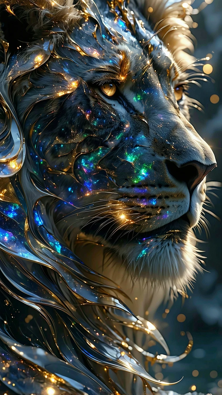 hyper-realistic gold, opal quartz, neon hues, silver holographic reflections, and cosmic textures