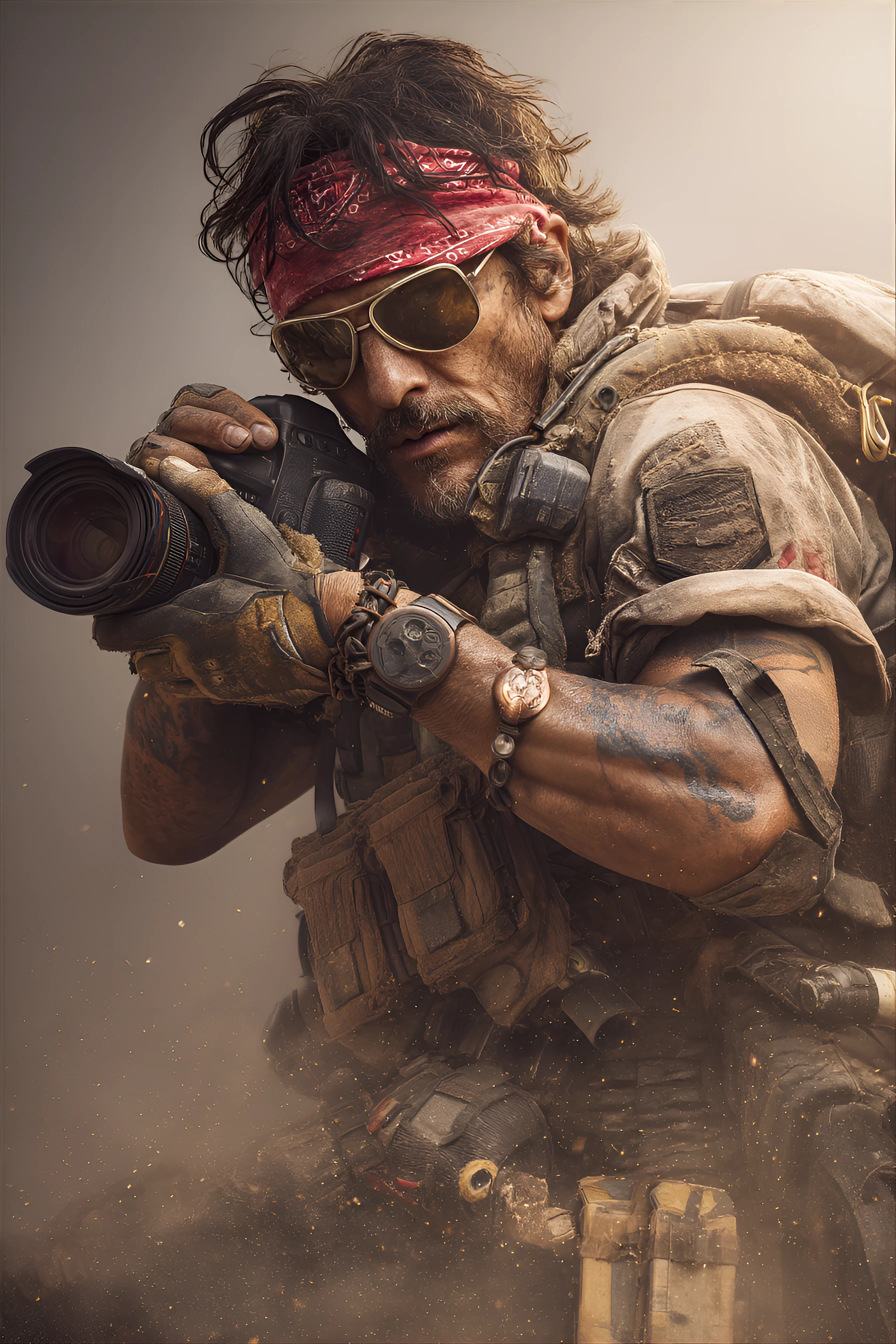 with a rugged, military-style outfit. He is holding a large camera,